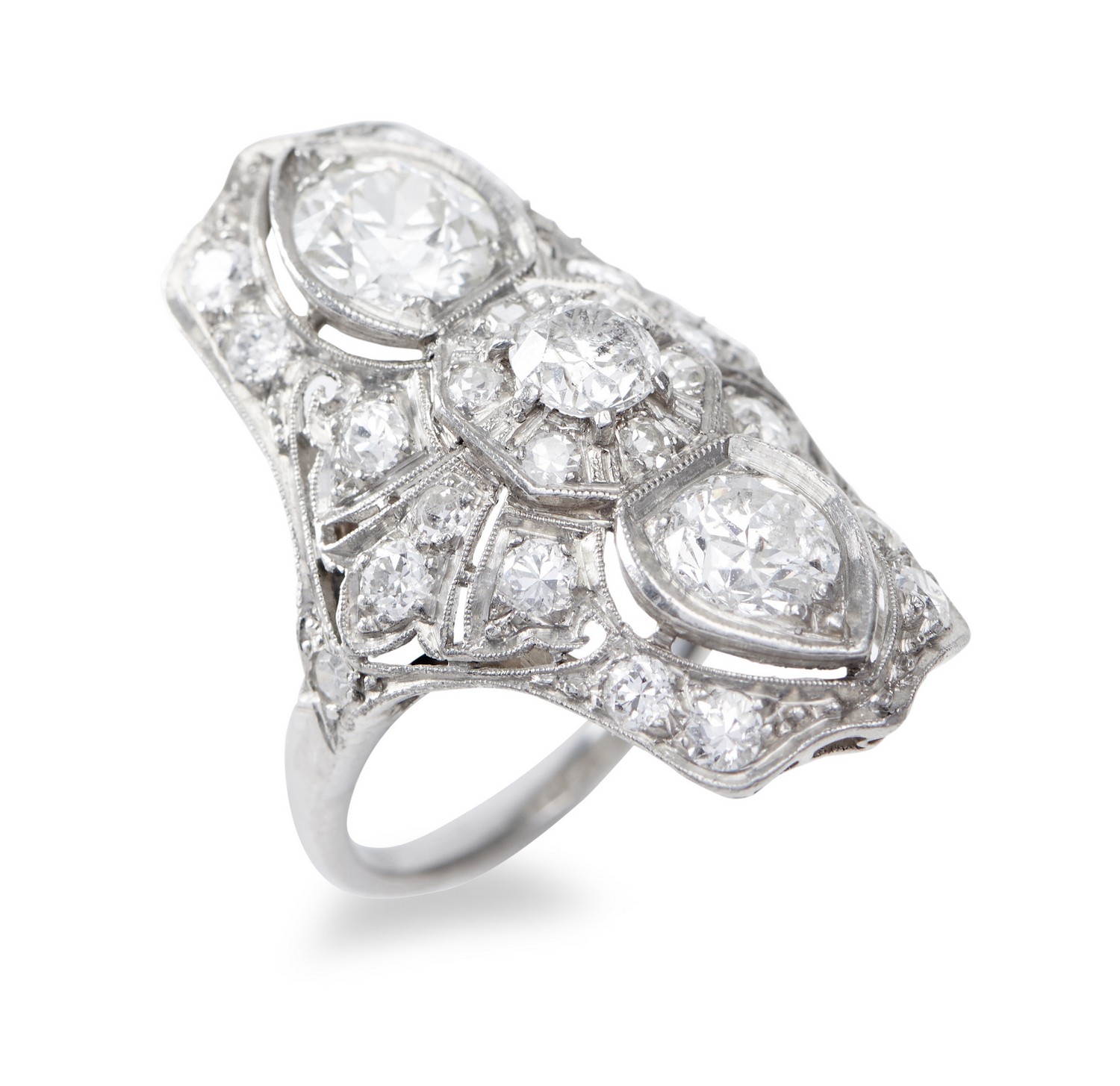 In very good condition with all stones secure in their settings. Centre diamonds H-I in colour an P1 Clarity. Ring XRF tested 80% platinum (plus) IR 9.65% - PD 1.93% - RH 4.83% (RH plated).