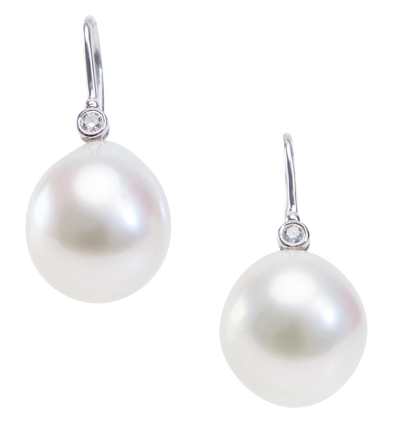 Each earring featuring a drop shaped pearl of silver white hues measuring 14.0mm by 15.5mm, suspended on a diamond surmount and shepherd hook fitting, in 18ct white gold.