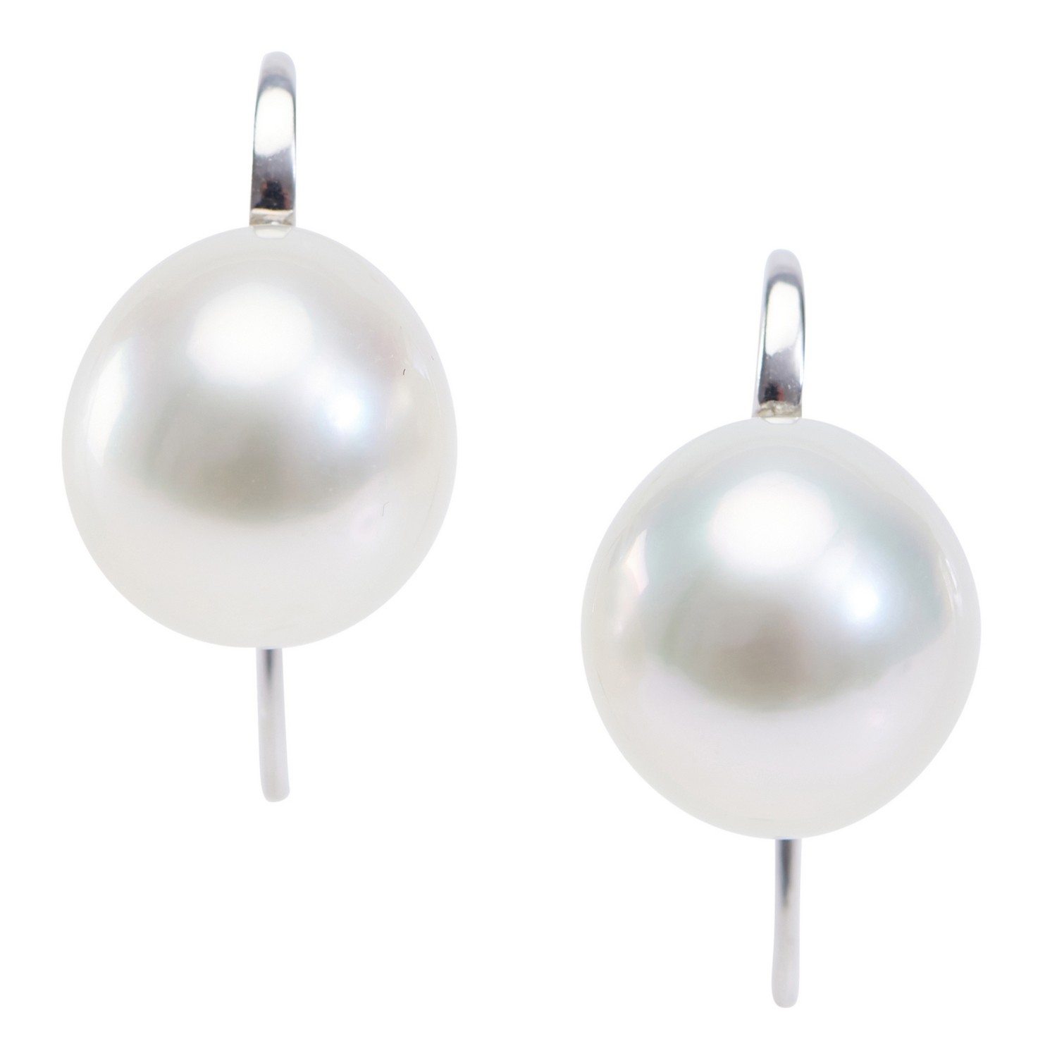 Each earring comprising an oval pearl of silver white hues, measuring 11.0mm by 12.0mm, to a shepherd hook fitting, in 18ct white gold.