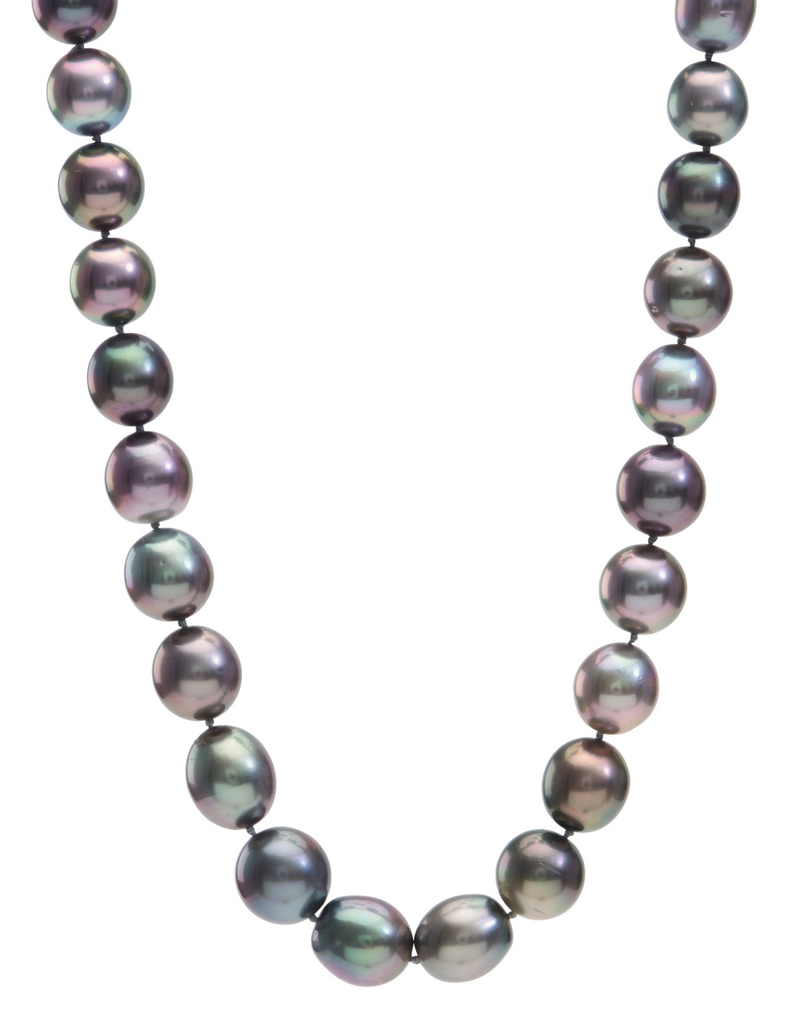 Comprising thirty five pearls of varying grey, silver and aubergine hues, measuring 10.15 to 12.7mm, to a diamond set ball clasp, in 18ct white gold, total length 460mm.