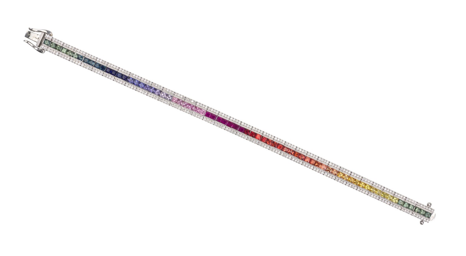 Comprising a central row of princess cut sapphires totalling 7.34cts, bordered by round brilliant cut diamonds totalling 1.10cts, in 14ct white gold, total length 180mm.
