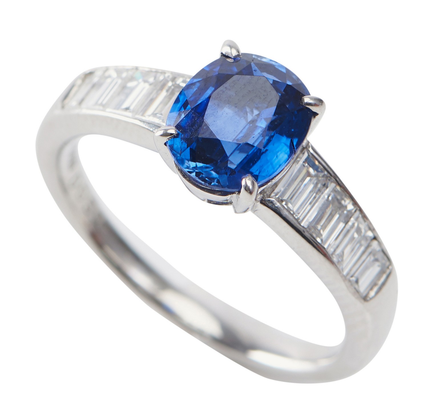 Featuring an oval sapphire weighing 1.83cts, flanked by graduating baguette cut diamonds altogether totalling 0.65cts, in 18ct white gold, ring size M 1/2.
