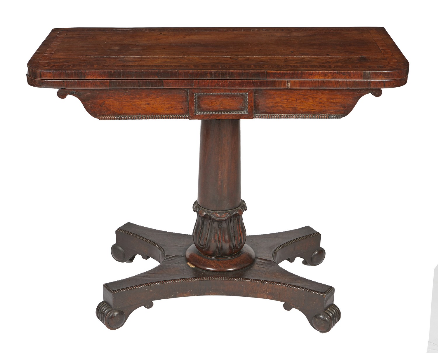 With mahogany crossbanding and finely gadrooned edges. The gunbarrel pedestal with a stylised lotus motif raised on a quadraform base and scrolled feet.