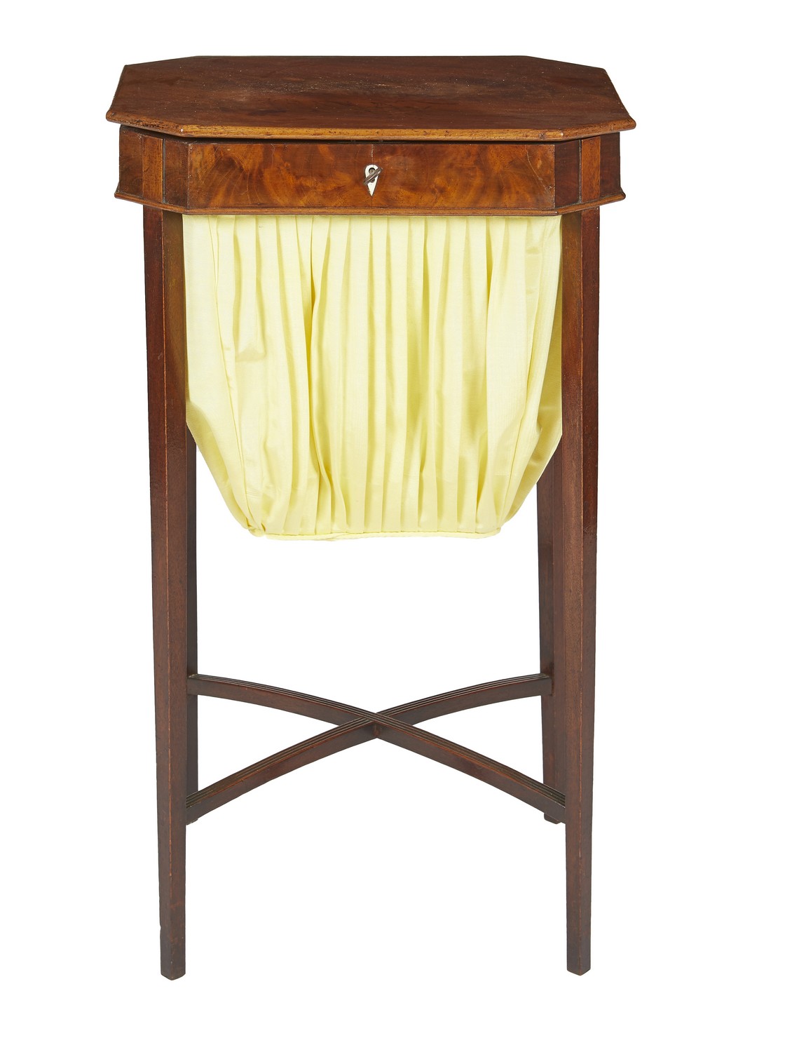 In mahogany and mahogany veneers on pearwood, with fine tapered legs and a fitted interior cross stretcher with yellow silk pouch.