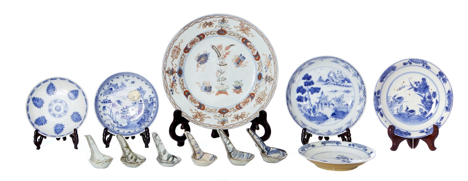 One polychrome decorated plate and six ceramic blue and white spoons.
