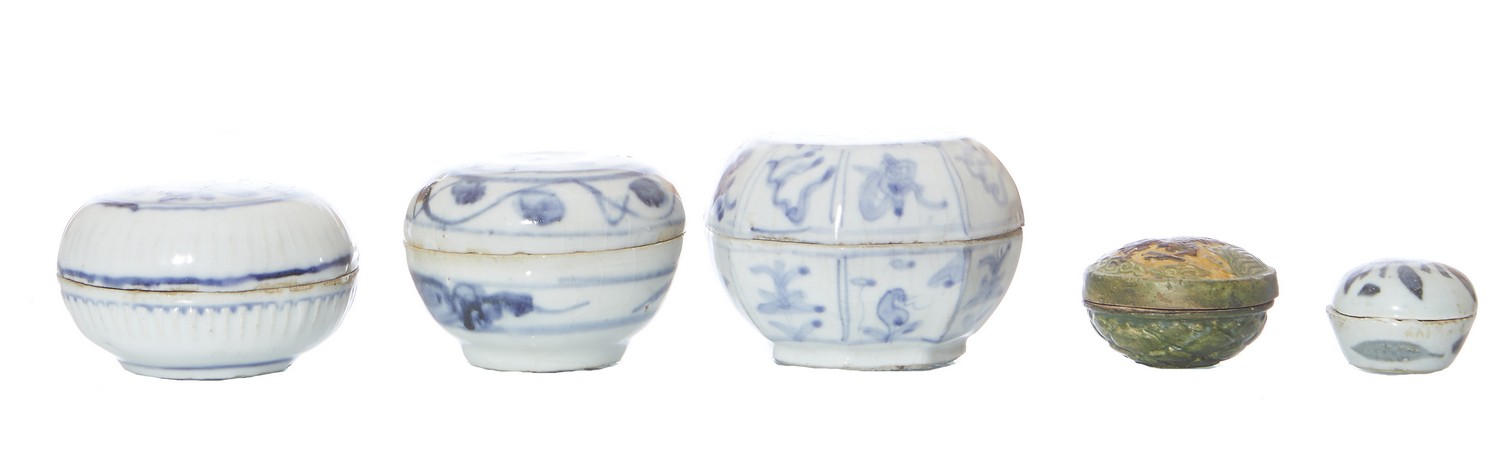 Comprised of four in underglaze blue and white porcelain with floral decorations and one in green and iron brown glazes on a moulded and incised body.