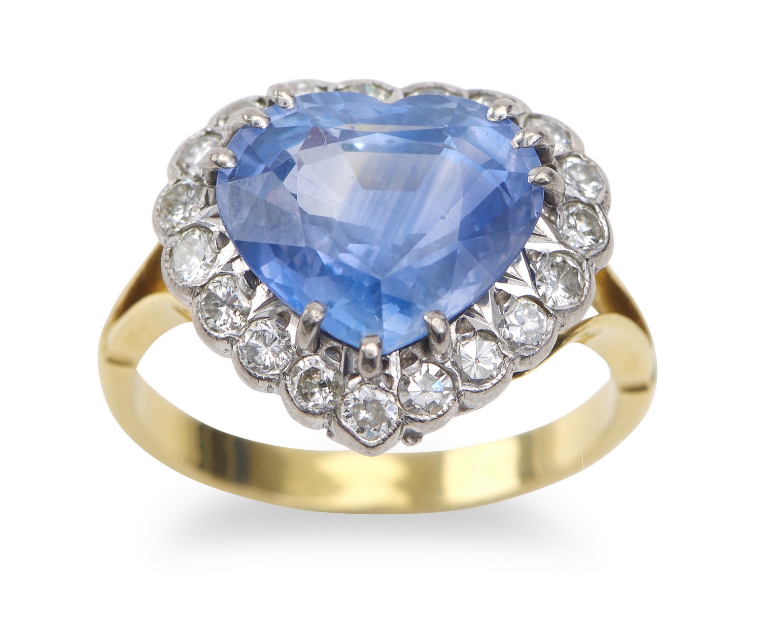Featuring a heart cut sapphire weighing 5.50cts, bordered by round brilliant cut diamonds totalling 0.57cts, in two tone 18ct gold, ring size N.