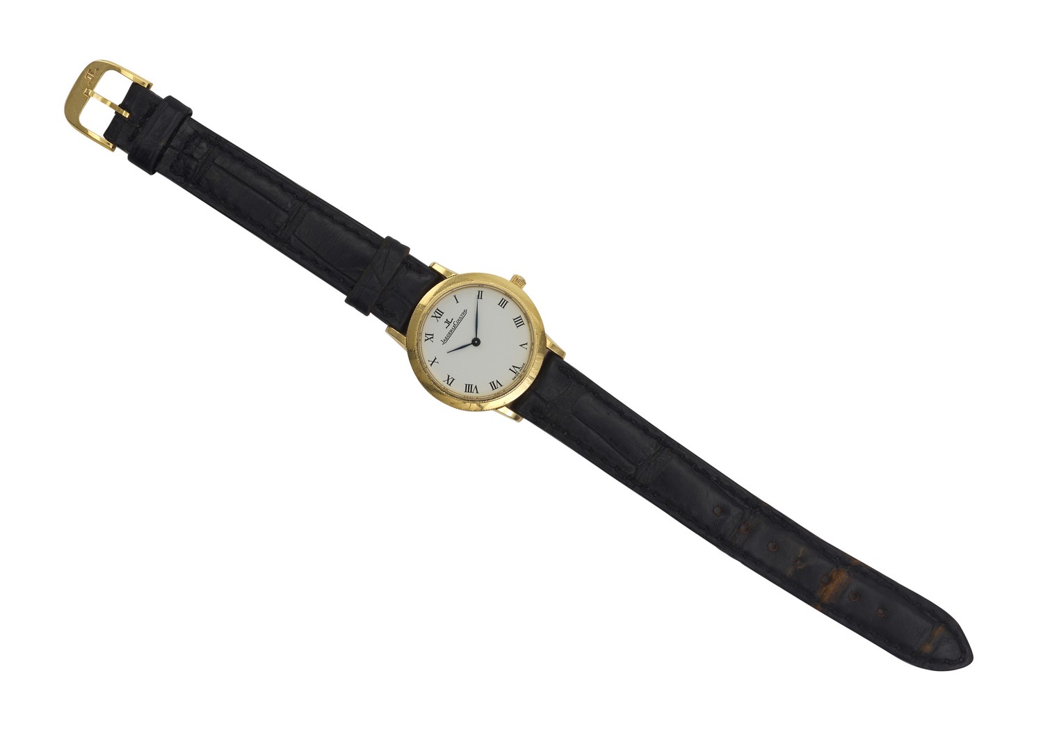 Manual wind, circular white dial with black Roman numerals, signed case, dial and movement, 18ct gold case and clasp to black leather bands, diameter 26mm.