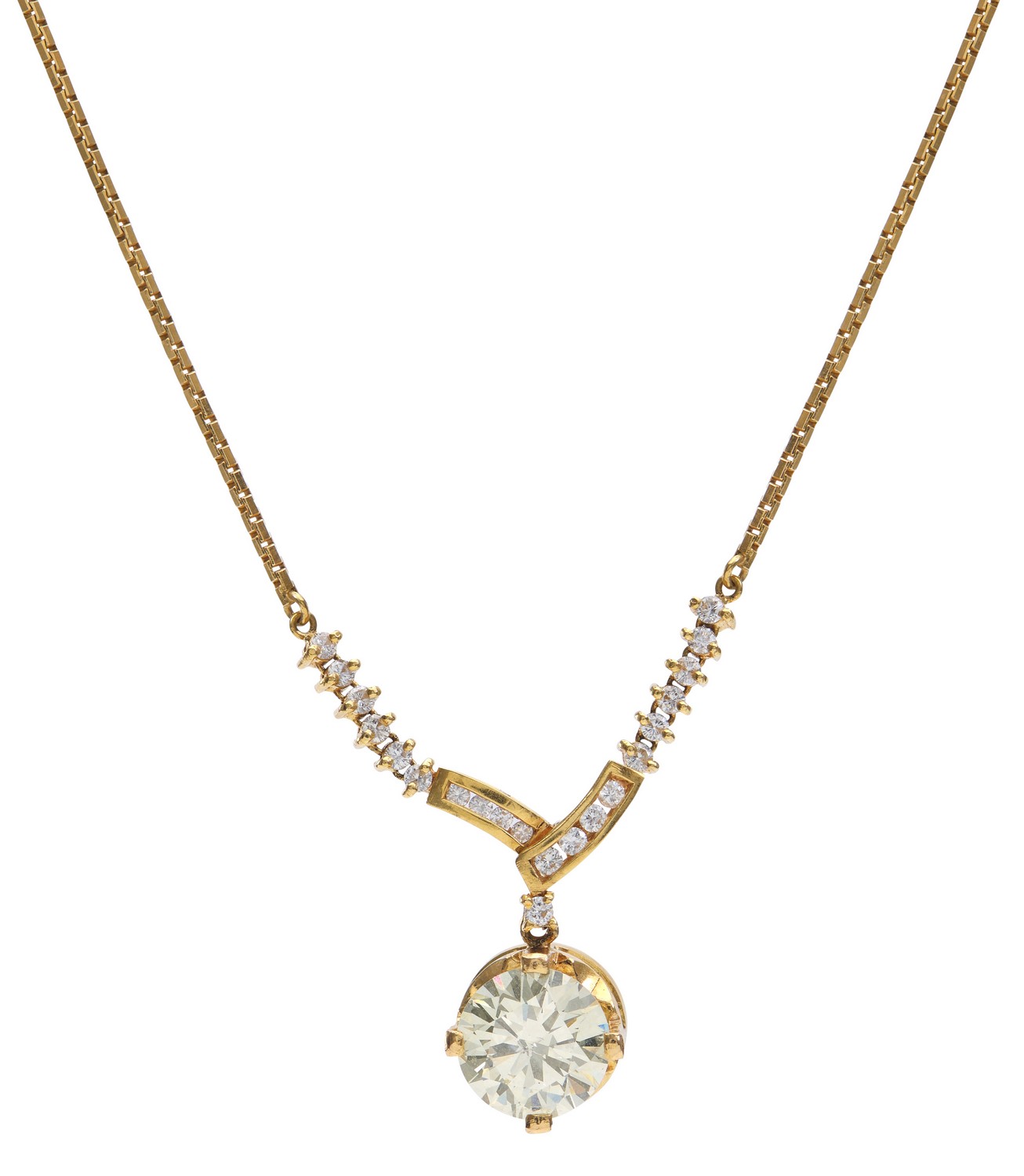 Featuring a round brilliant cut diamond weighing an estimated 3.50cts, suspended on a 'V' shaped diamond set bale, totalling a further 0.40cts, in 22ct gold.