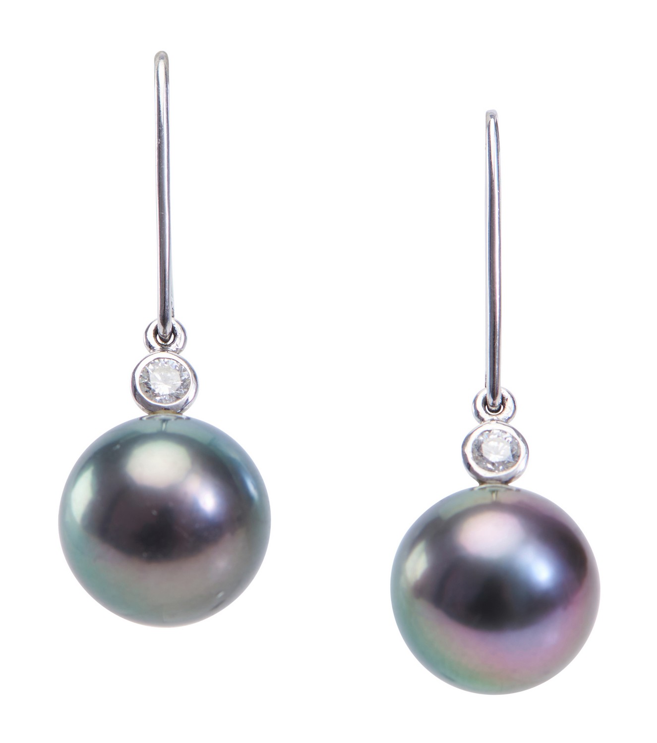 Each earring comprising a round pearl of grey and aubergine hues, measuring 12.0mm, suspended on a round brilliant cut diamond surmount and elongated shepherd hook fitting, in 18ct white gold.