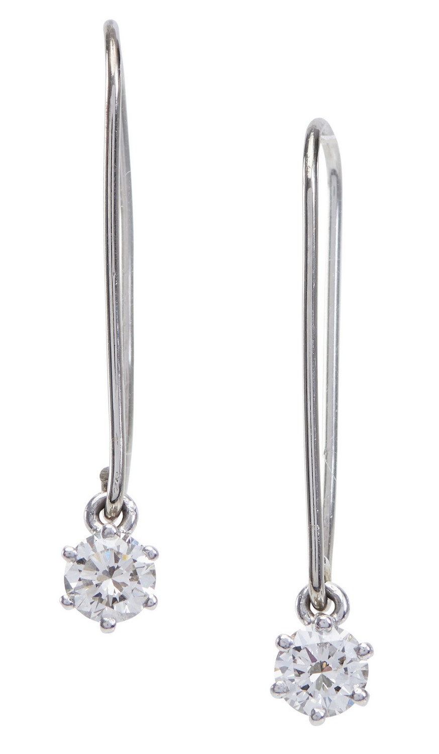 Each earring suspending a round brilliant cut diamond weighing an estimated 0.45cts, on elongated shepherd hook fittings, in white gold.
