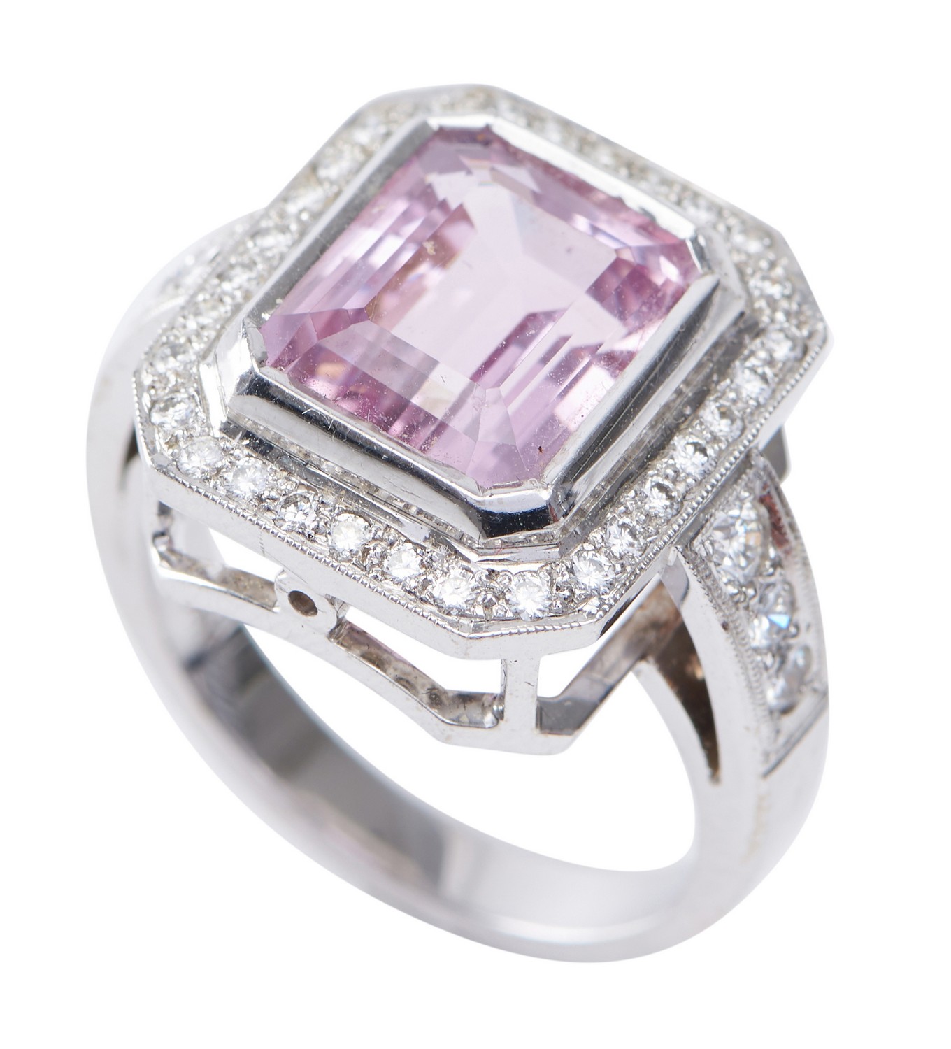 Featuring an emerald cut kunzite weighing an estimated 5.55cts, within a border of round brilliant cut diamonds and diamond set shoulders, in 18ct white gold, ring size O 1/2.