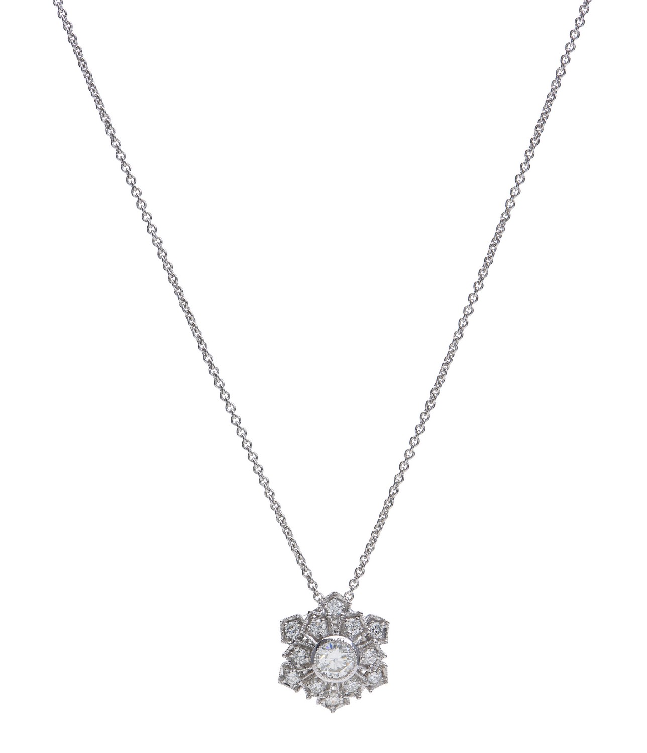 Of snowflake design, set with round brilliant cut diamonds totalling 0.47cts, in 18ct white gold.