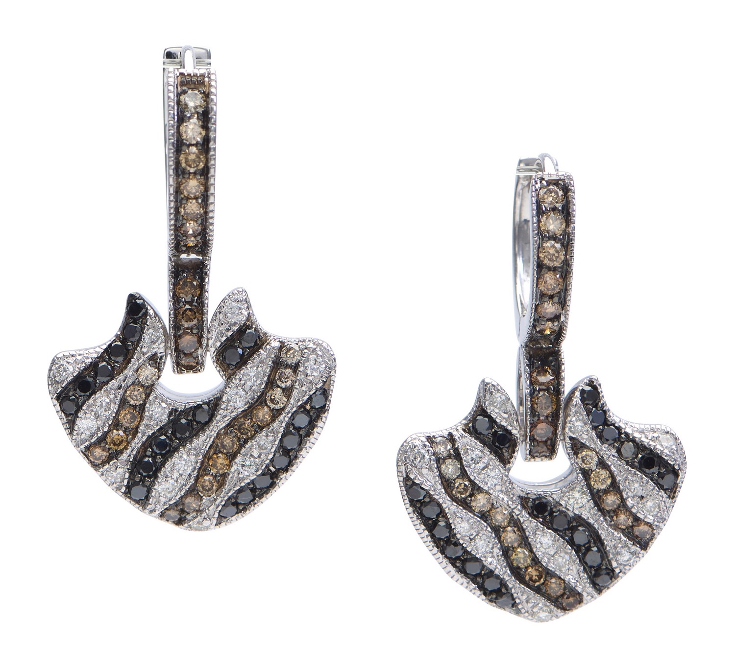 Of triangular form, each earring comprising waved rows of black, cognac and white diamonds totalling 1.23cts, in 18ct white gold.