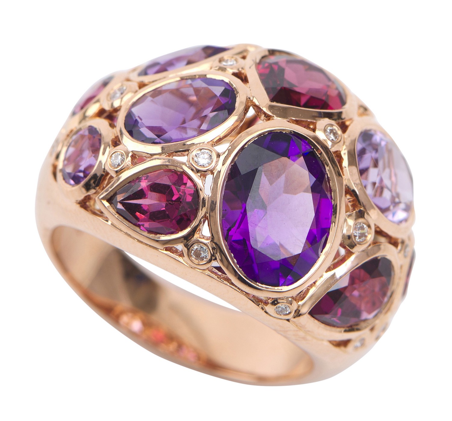 Of bombe design, comprising semi-precious gem varieties in shades of pink, purple and red, with round brilliant cut diamond detail, in 18ct rose gold, ring size M 1/2.