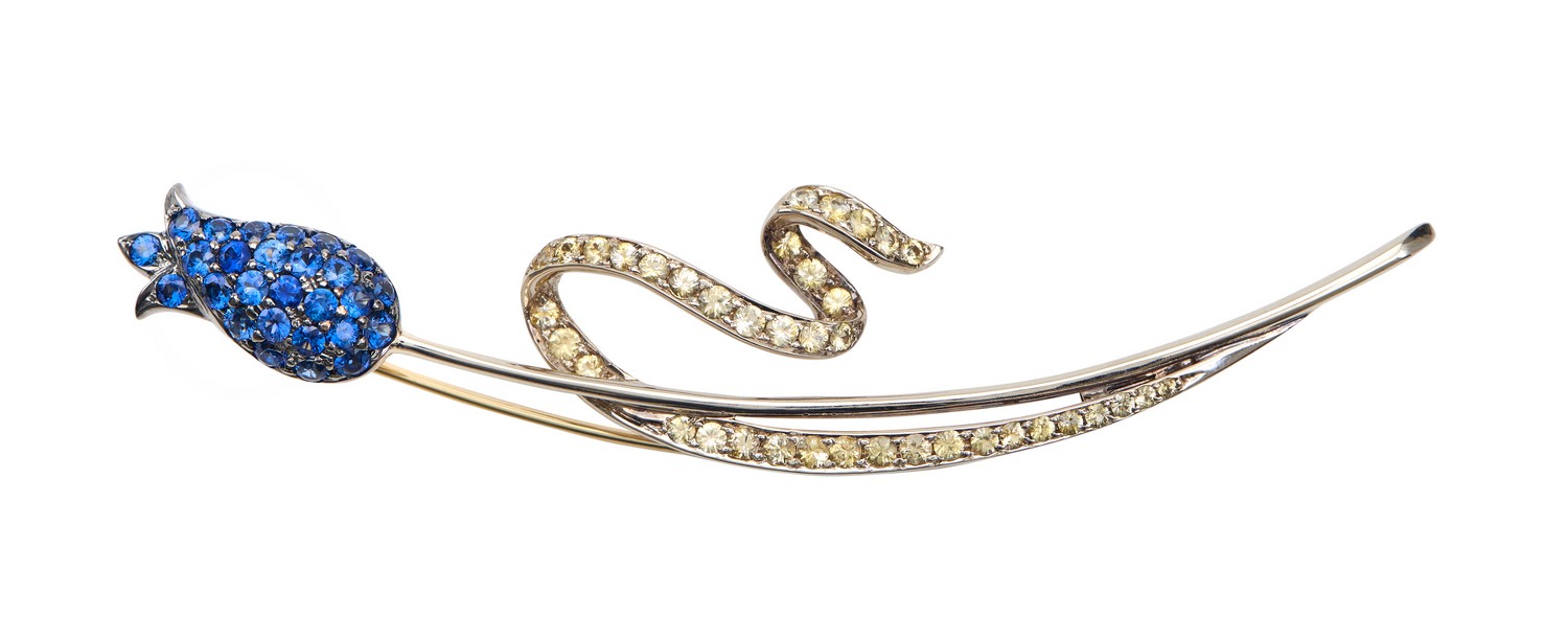 Styled as a flower, comprising blue sapphire set petals, and green sapphire stem and leaves, in 18ct white gold.