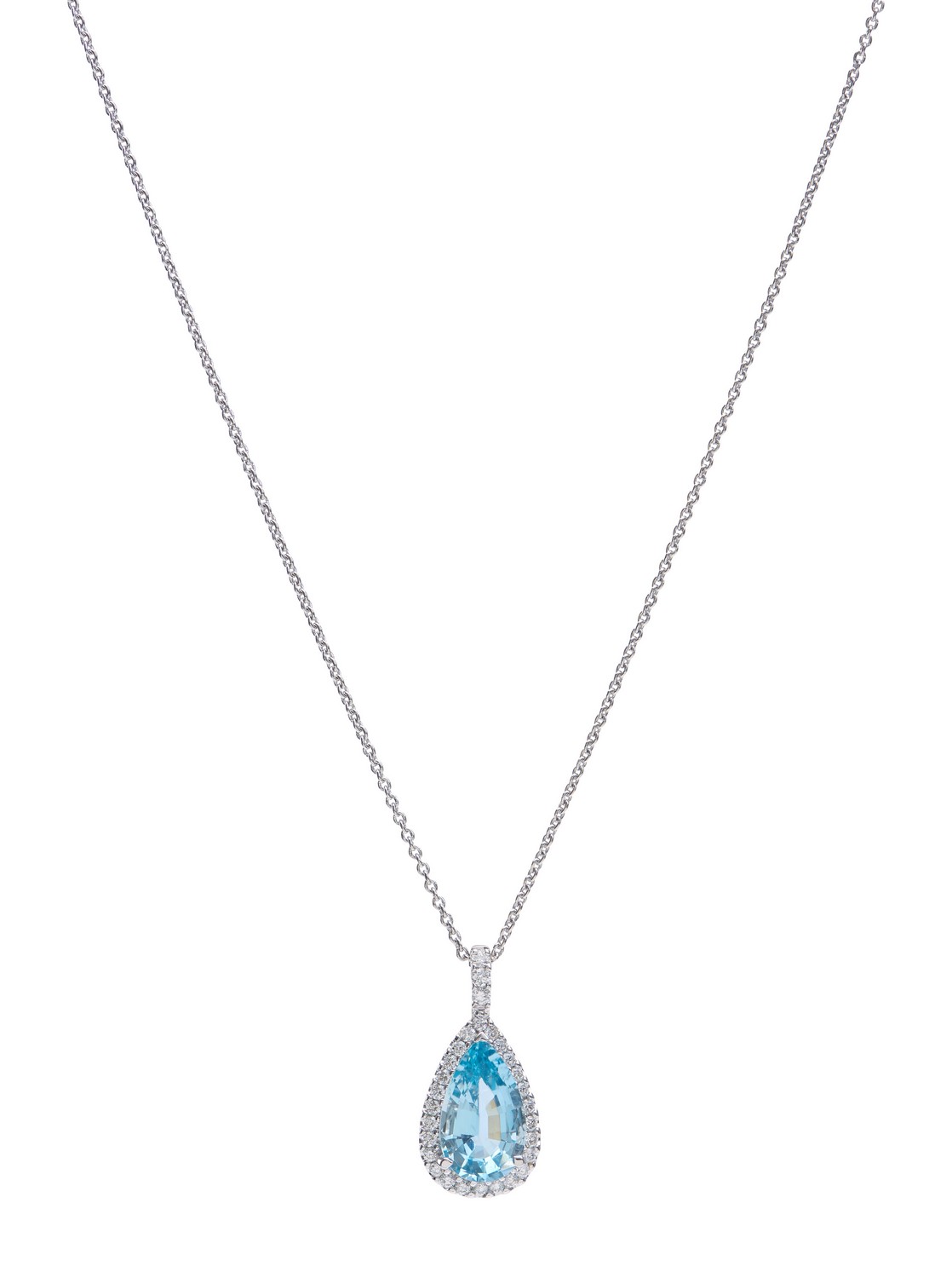 Featuring a pear cut aquamarine weighing 1.93cts within a surround of round brilliant cut diamonds and diamond set bale, all totalling 0.27cts, in 18ct white gold.