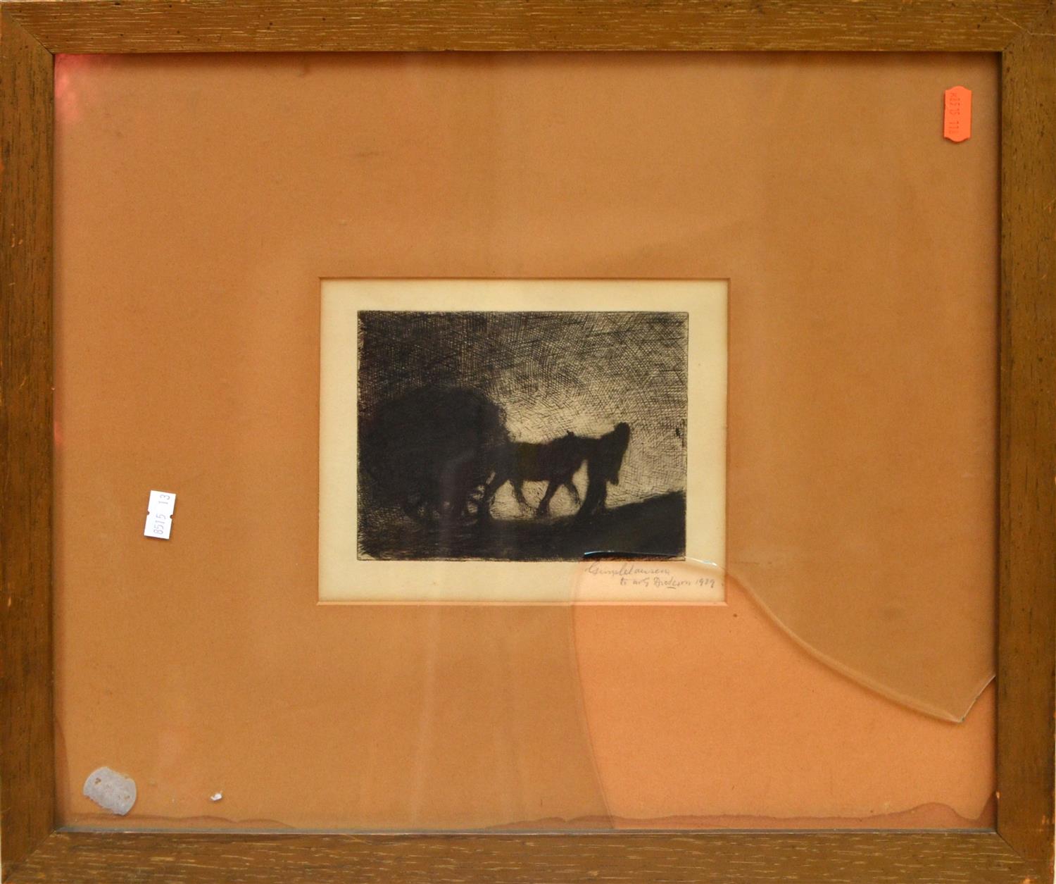 SIR GEORGE CLAUSEN, THE LOAD, ETCHING, 12 X 15CM, FRAMED: 43 X 50CM, CONDITION: ARTWORK FAIR BUT FOXING AND DISCOLOURATION PRESENT, GLASS HEAVILY BROKEN, LEONARD JOEL DELIVERY SIZE: SMALL
