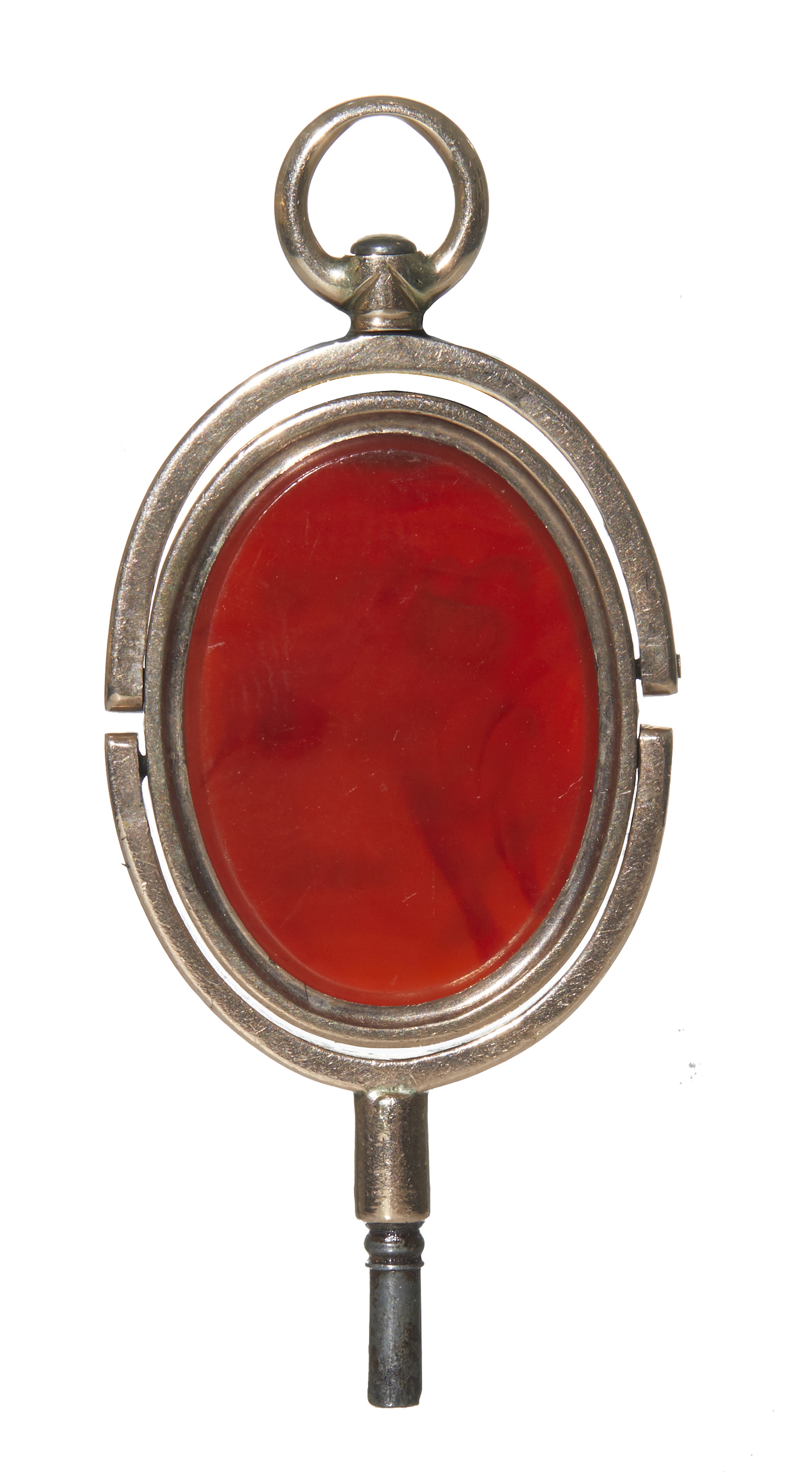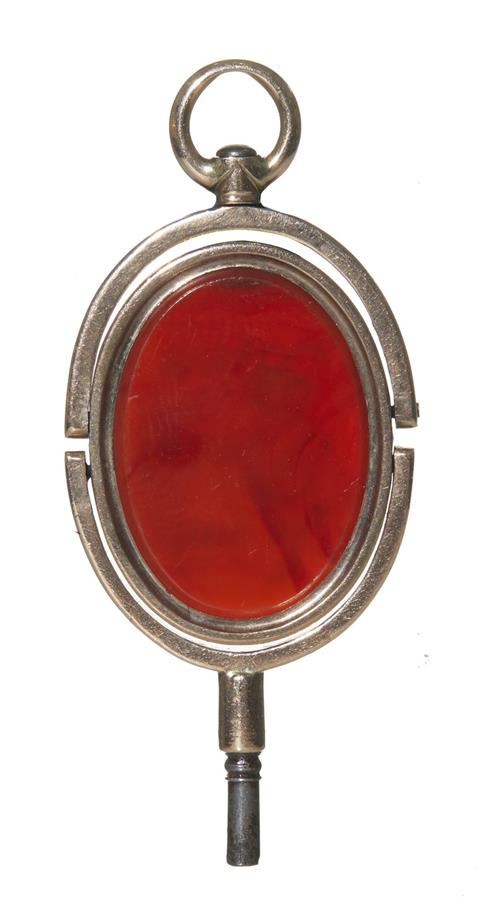 AN OVAL GOLD AND CARNELIAN WATCH KEY FOB