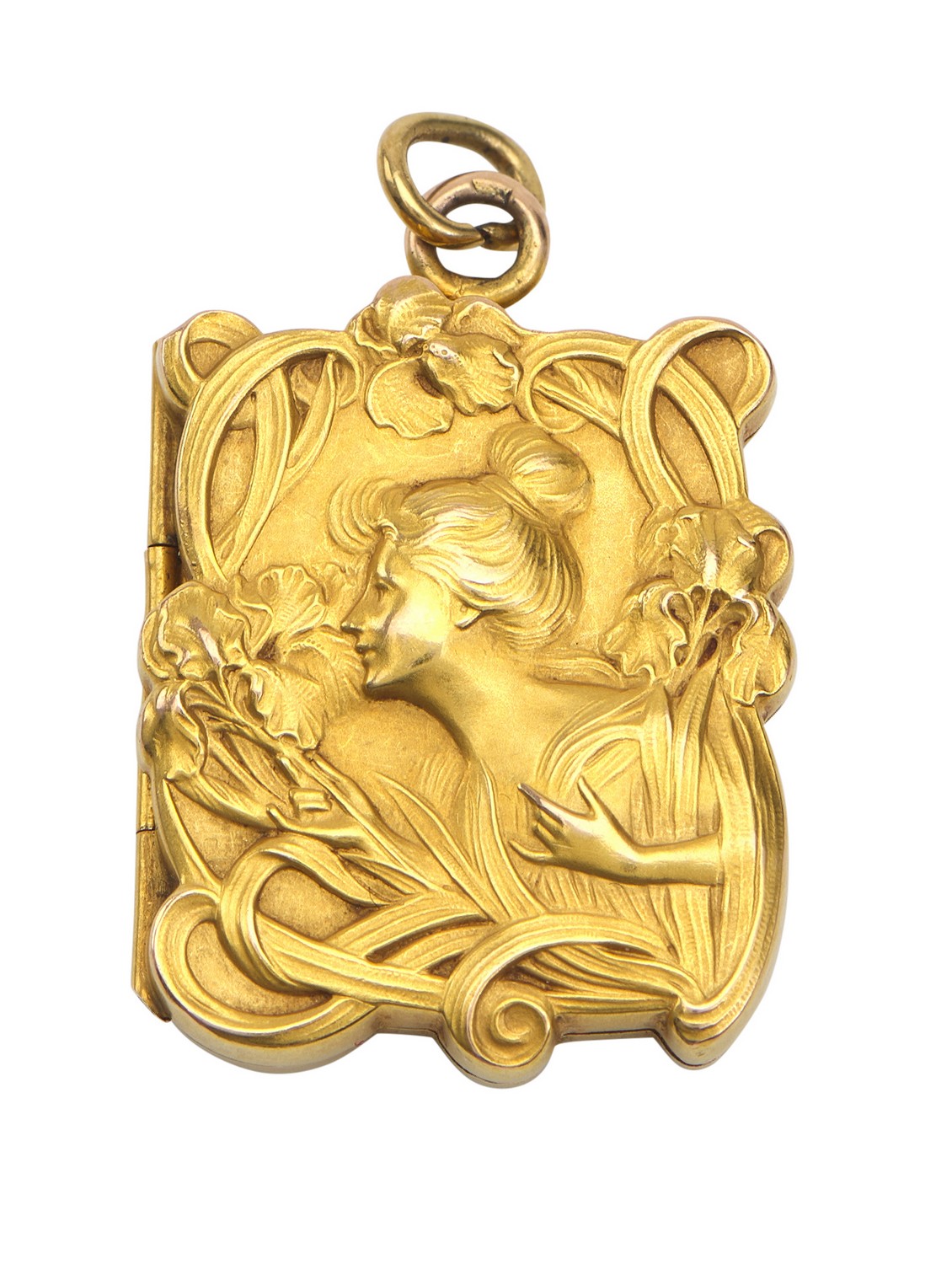 The rectangular hinged locket with embossed decoration, in 9ct gold.