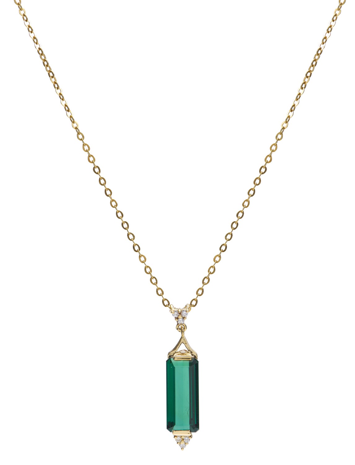 The rectangular green tourmaline weighing an estimated 4.45cts, set to the base with a trefoil of round brilliant cut diamonds, suspended on a conforming diamond bale, signed, on a trace chain, both in 18ct gold, boxed.