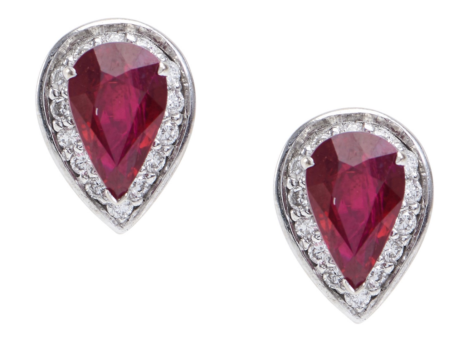 Of cluster design, each earring featuring a pear cut ruby weighing an estimated 0.75cts, within a fine border of round brilliant cut diamonds, in 18ct white gold.