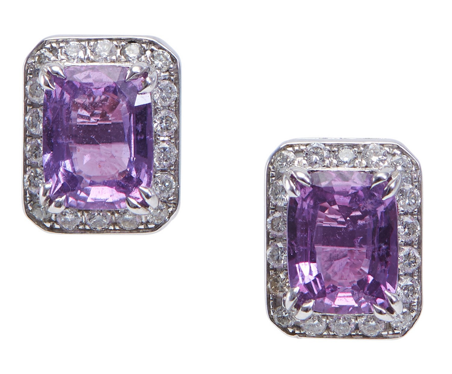 Each earring of rectangular cluster design, featuring an oval purple sapphire within a fine border of round brilliant cut diamonds, in 18ct white gold.