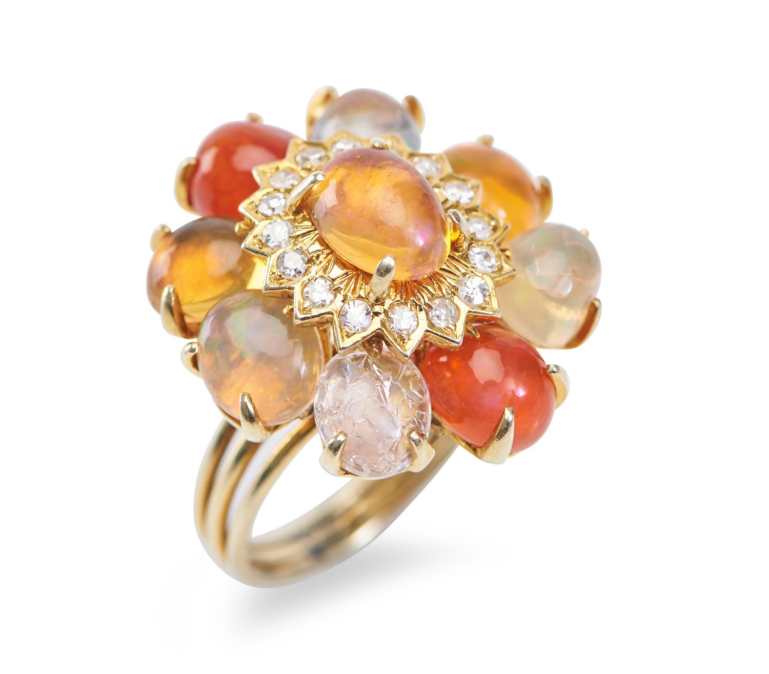 Of large cluster form, comprising a central oval opal cut en cabochon, framed in a surround of round brilliant cut diamonds and further surrounded by eight opals in varying shades of orange, in 14ct gold, ring size N.