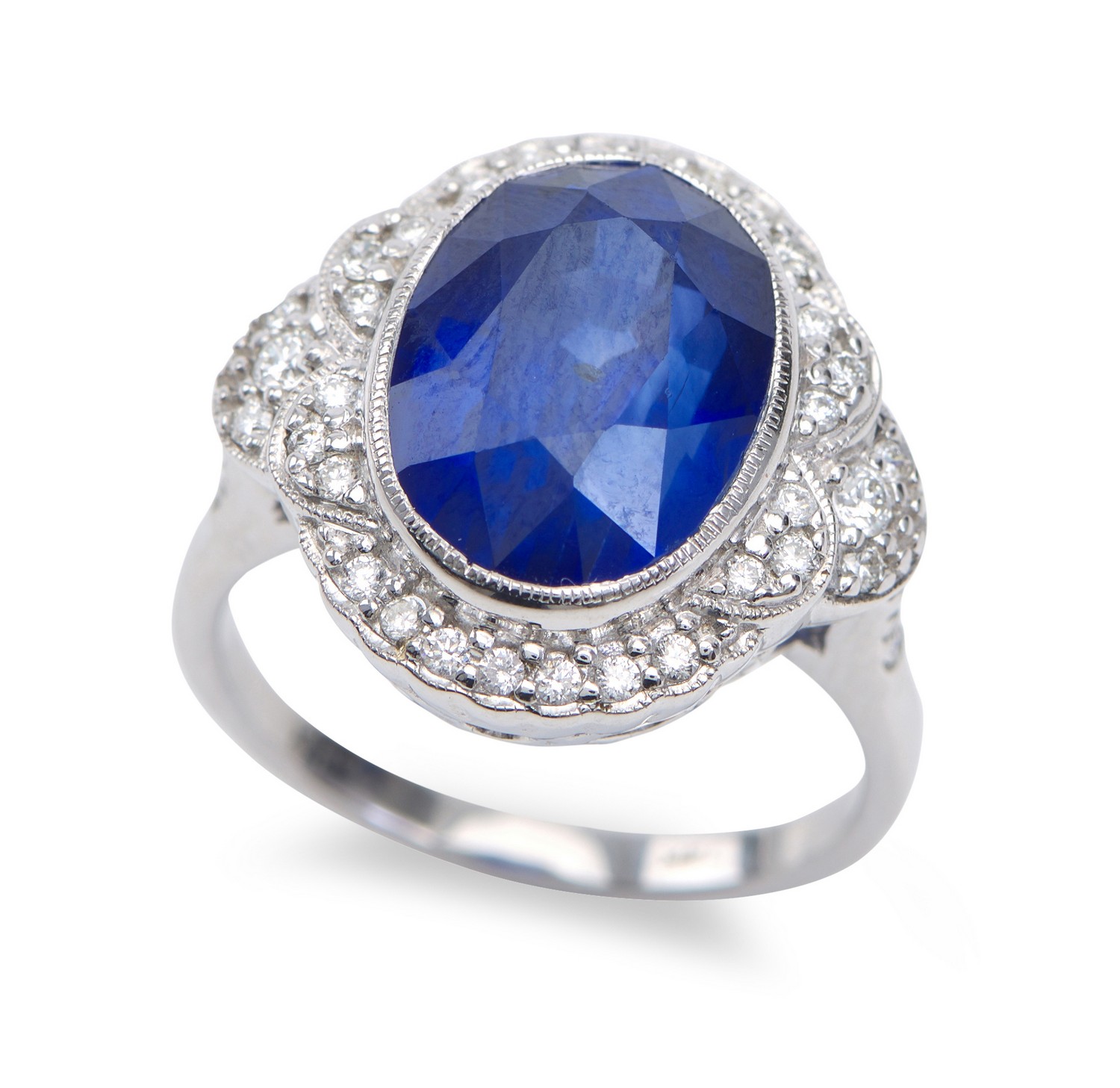 Centrally set with an oval cut sapphire weighing 9.32cts, within a border of round brilliant cut diamonds, in 18ct white gold, ring size M.