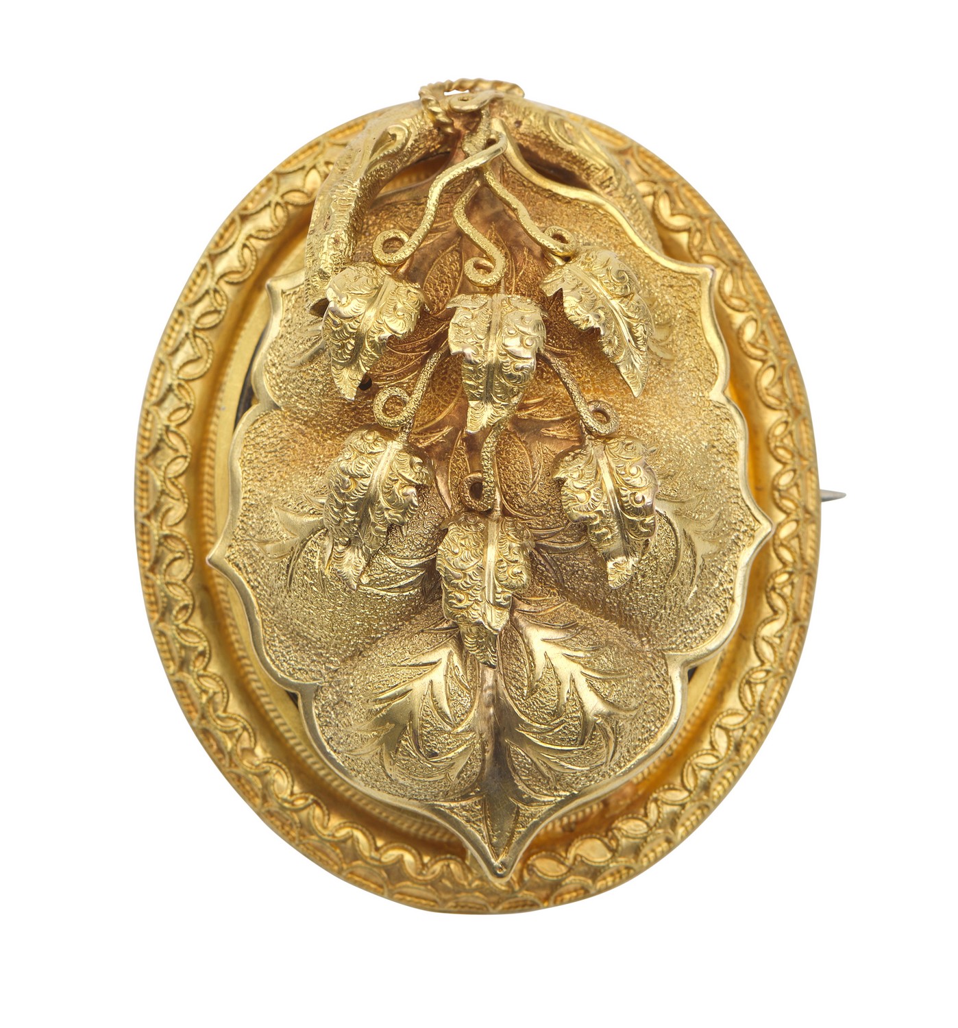The oval brooch with applied rope twist border, having a central hinged foliate panel with concealed glazed locket and further locket to verso, in 15ct gold.
