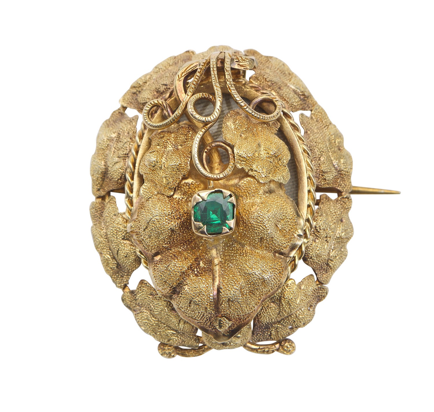 Of ovoid foliate design, having a central hinged panel with applied leaf and tendrils detailed with green paste, with concealed glazed locket, in 15ct gold.