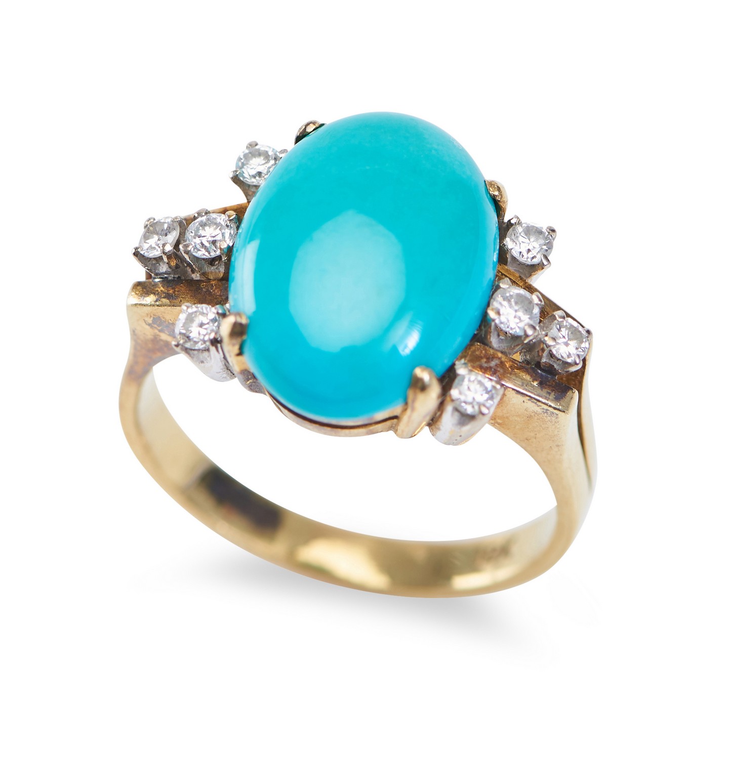 Featuring an oval turquoise cut en cabochon, flanked by four round brilliant cut diamonds, in 18ct gold, ring size N.