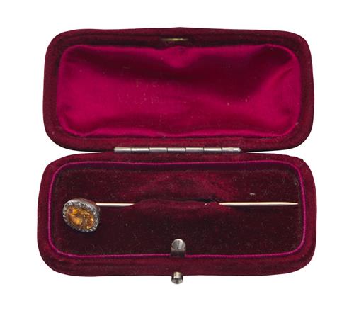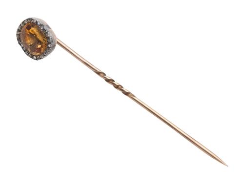 Featuring an orange cushion cut topaz, within a fine border of mine cut diamonds, in 9ct gold and silver.