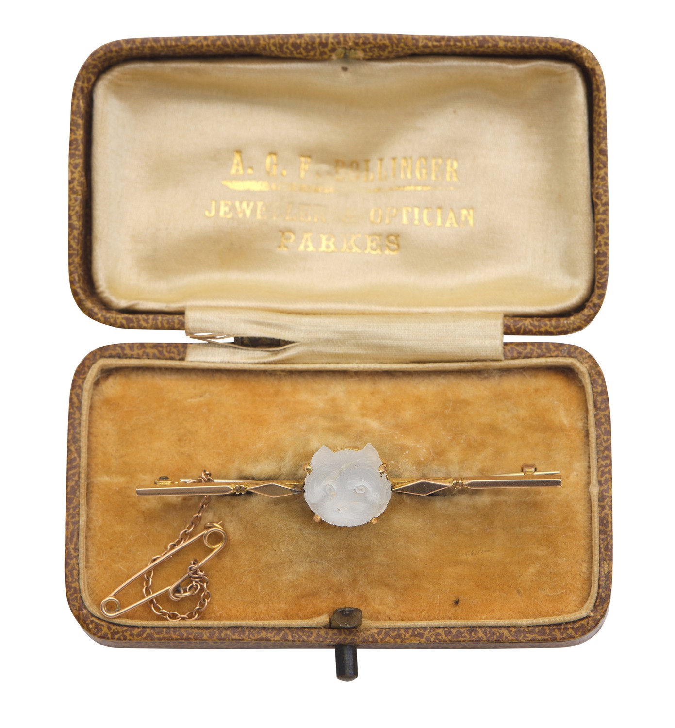 Bar is marked "PROUDS" 9ct. Fox head is thought to be a possible later addition to the brooch.