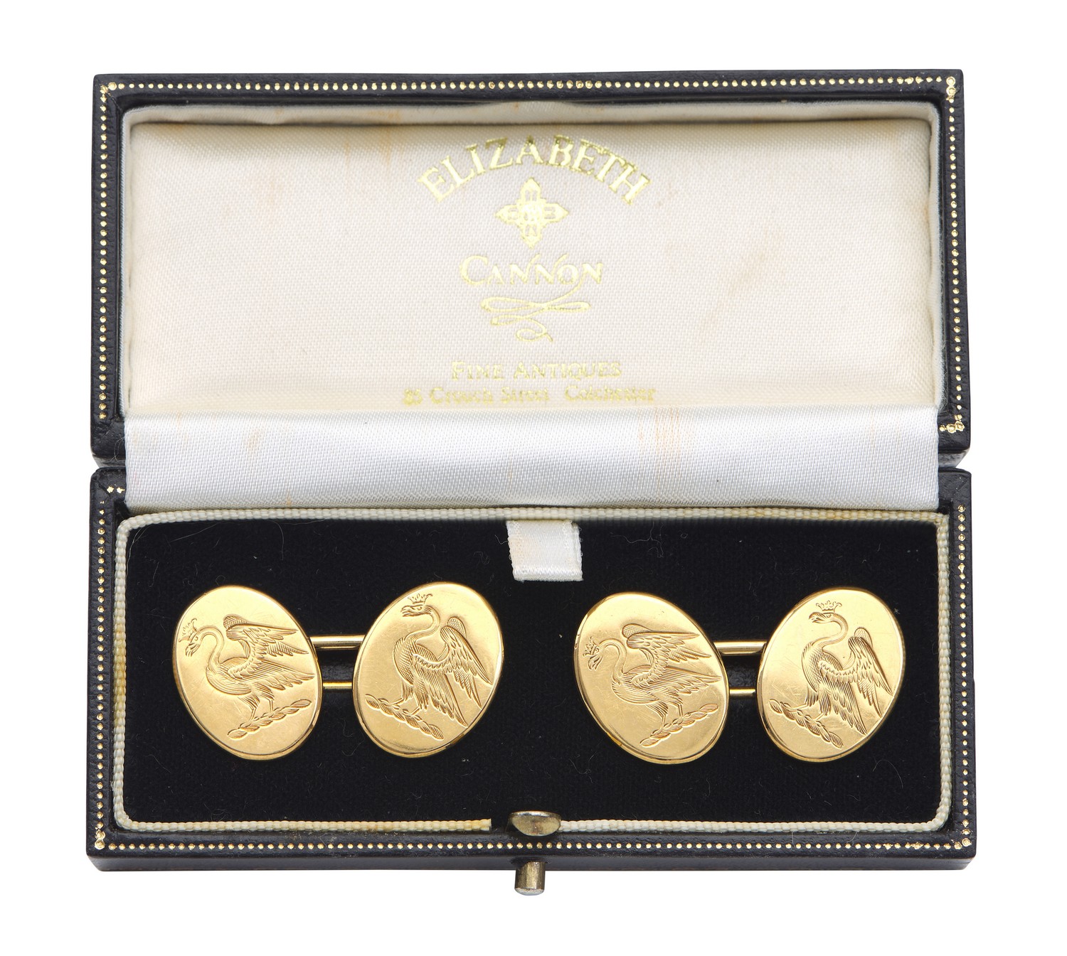 The oval plaques with engraved detail, in 18ct gold, retailed by Elizabeth Cannon Antiques of Essex, boxed, circa 1880.