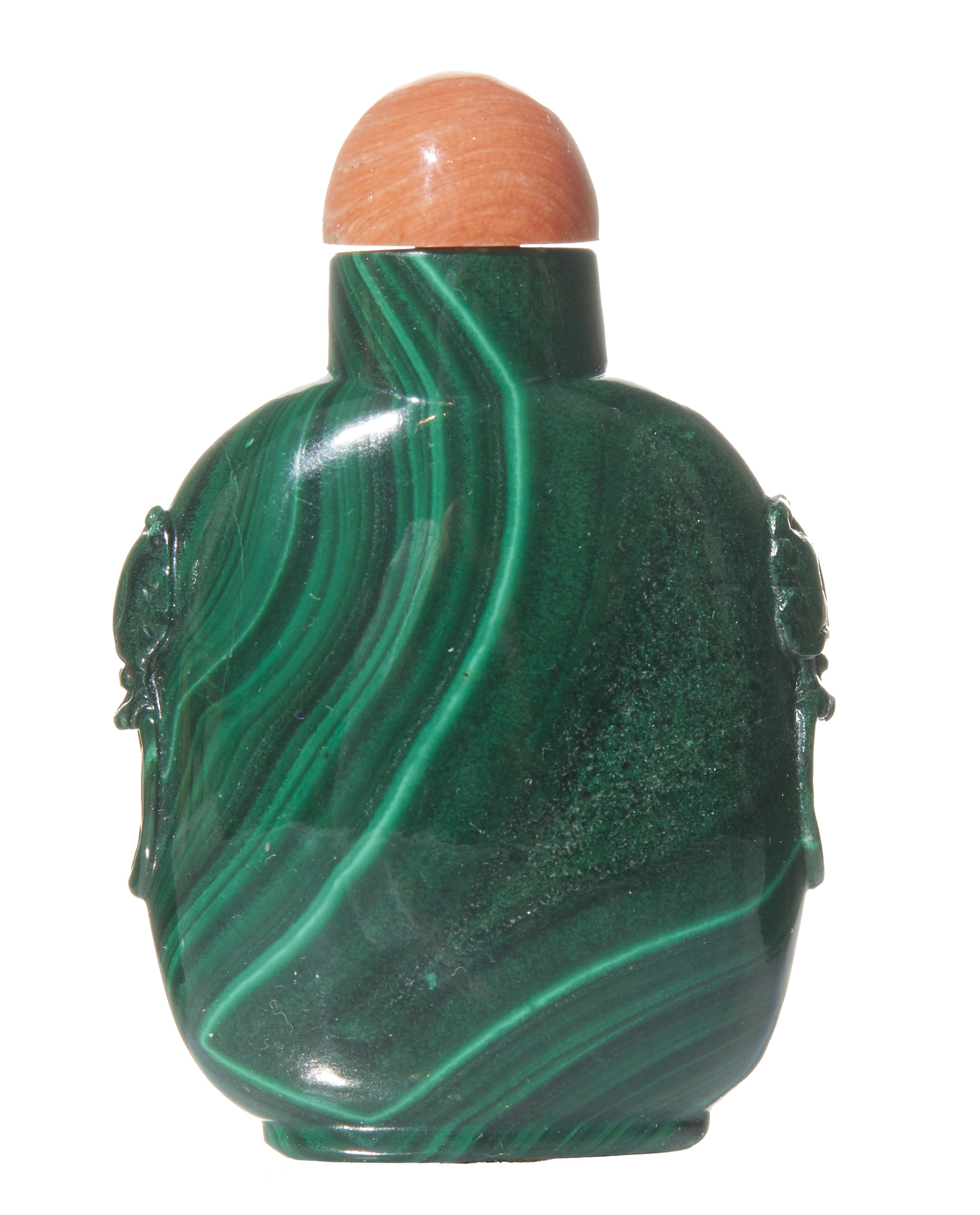 Plain design with carved mask and ring handles with a coral stopper.