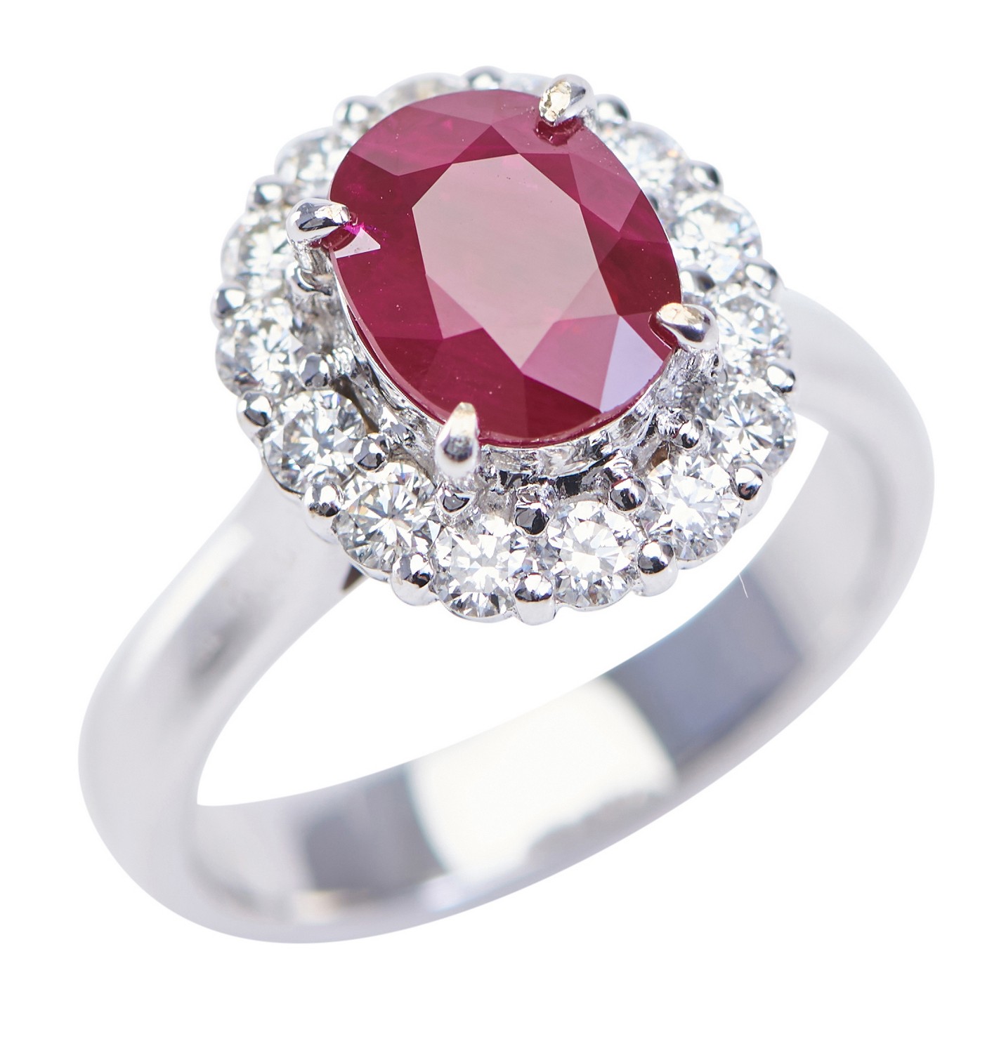 Of cluster design, featuring an oval ruby weighing 2.41cts surrounded by round brilliant cut diamonds totalling 0.70cts, in 18ct white gold, ring size N, with accompanying GRS gemstone report number 2014-013052, stating natural ruby and origin Burma.
