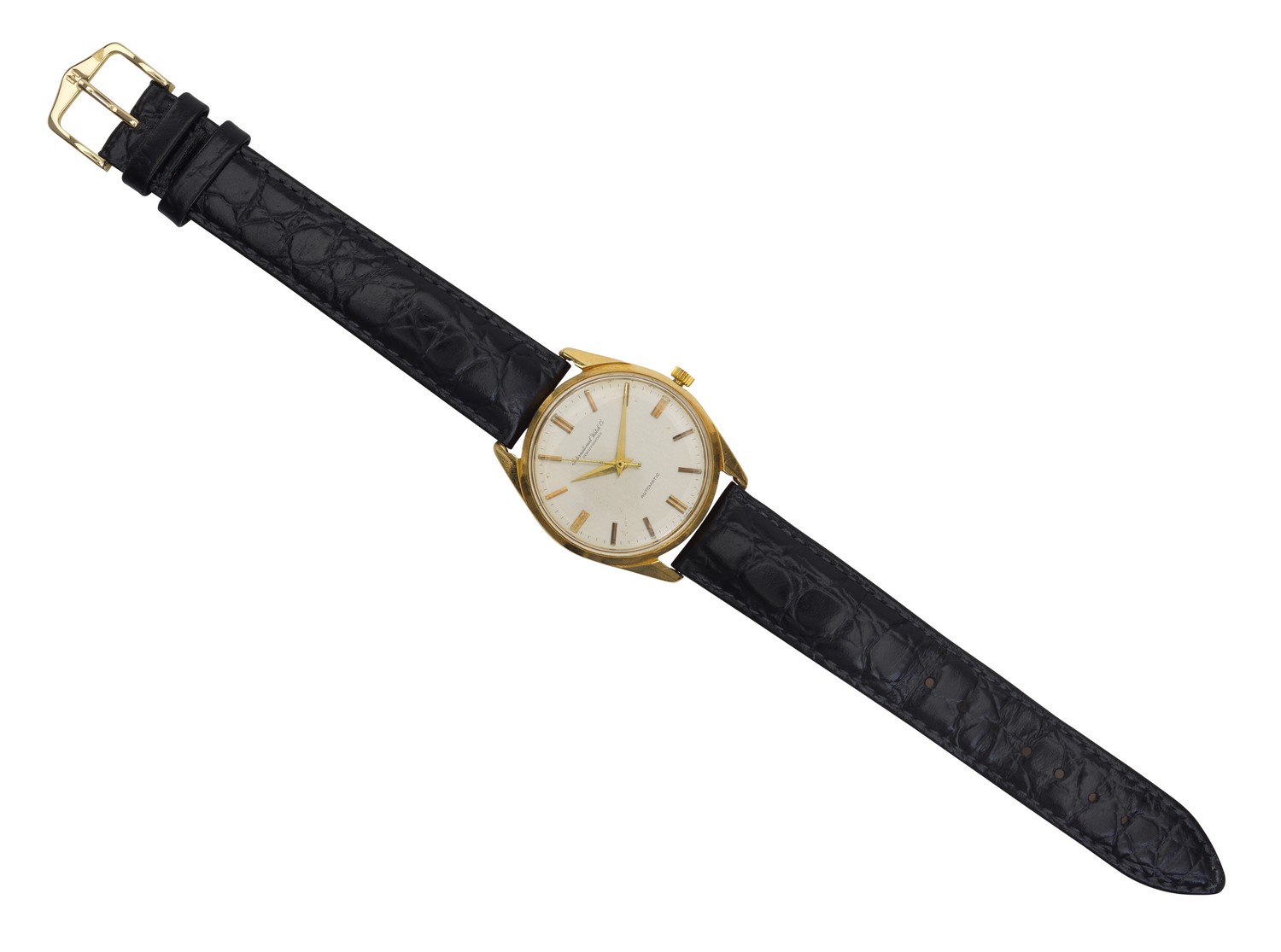 Automatic movement, circular silvered dial with gold baton numerals, 18ct gold case to black leather bands, diameter 34.5mm, engraving to verso.