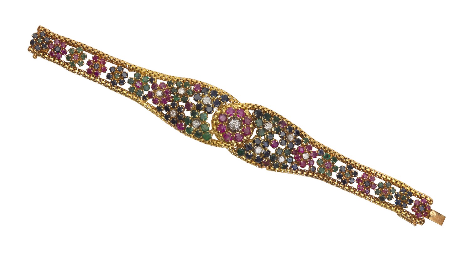 Comprising floral clusters of pink and blue sapphires and emeralds, centred with opposing coloured gems or round brilliant cut diamonds, within a mesh border, all in 18ct gold, total length 180mm.