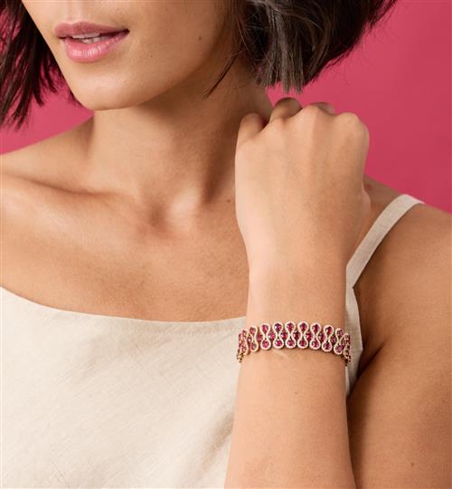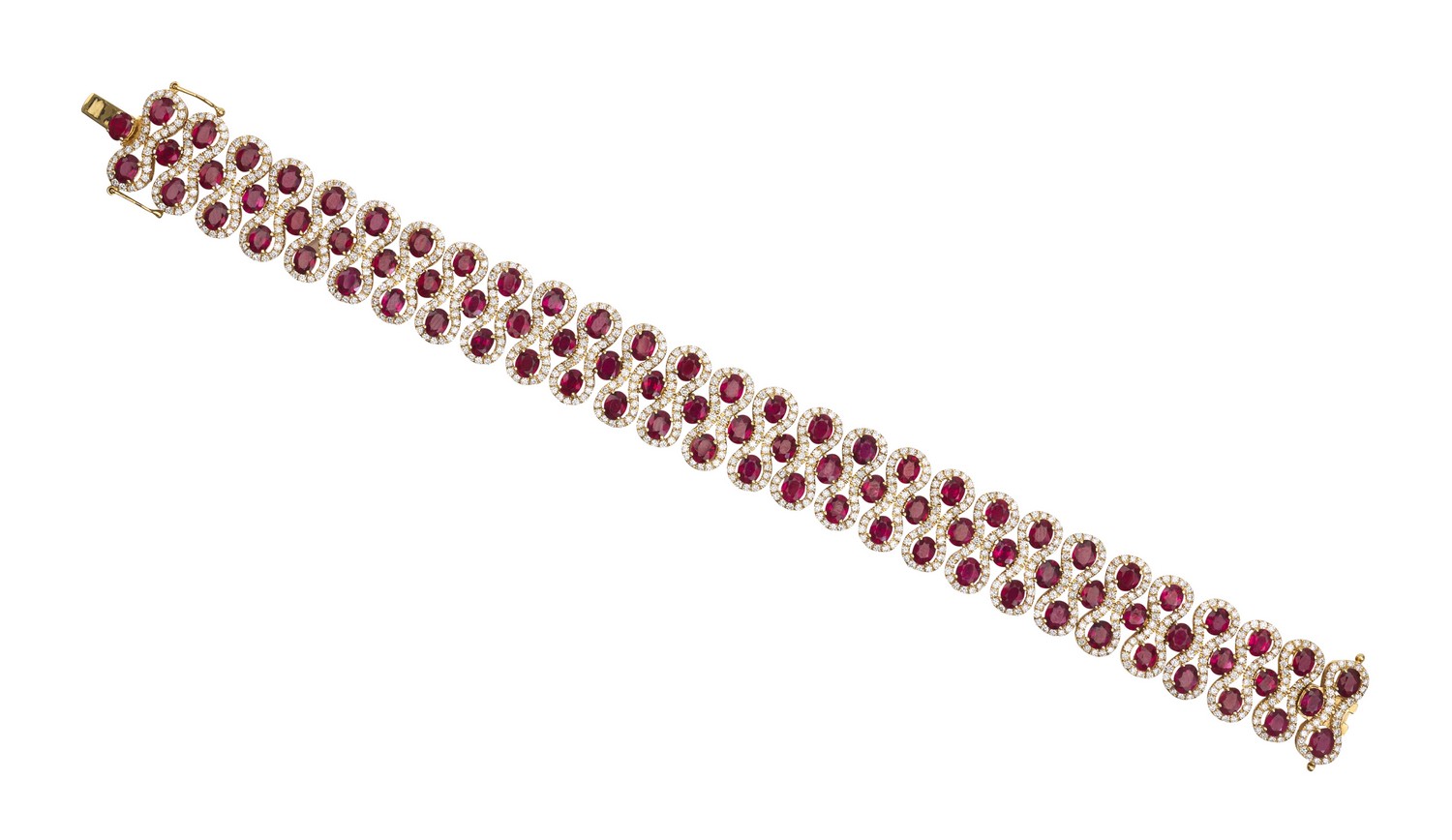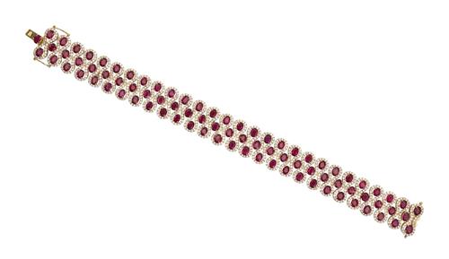 Comprising articulated links, each set with two oval cut rubies within a fine border of round brilliant cut diamonds, spaced by claw set rubies altogether totalling an estimated 12.6cts, in 18ct gold, total length 185mm.
