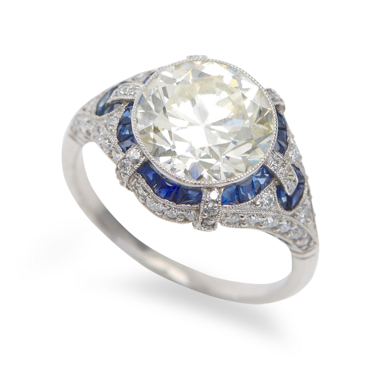 Of Art Deco style, featuring an old European cut diamond weighing 3.31cts, within a decorative surround of fine calibre cut sapphire and diamonds, in platinum, ring size M.