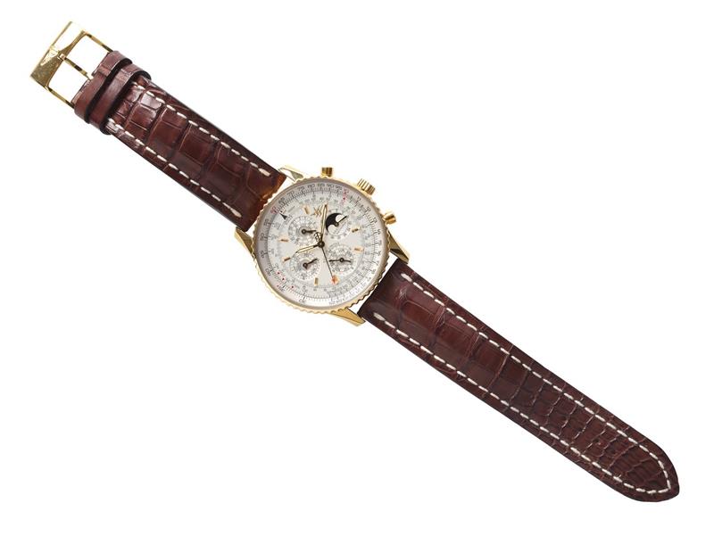 Navitimer QP automatic movement, caliber B29 by ETA SA, circular silver dial with gold baton numerals, slide rule bezel and stop watch for airborne and flight calculations, indicates the day, date, week, month, seasons, leap years and moon phases, signed, reference K29320, number 57933, edition 34 of 50 with original box, corrector tool, presentation box, instructions, certificate papers, tag and receipt, circa 2002. Grande complication chronographe chronometer quantieme perpetuel limited edition two-planes logo on dial and back in polished 18K yellow gold case sapphire glass and crocodile strap, 42mm diameter.