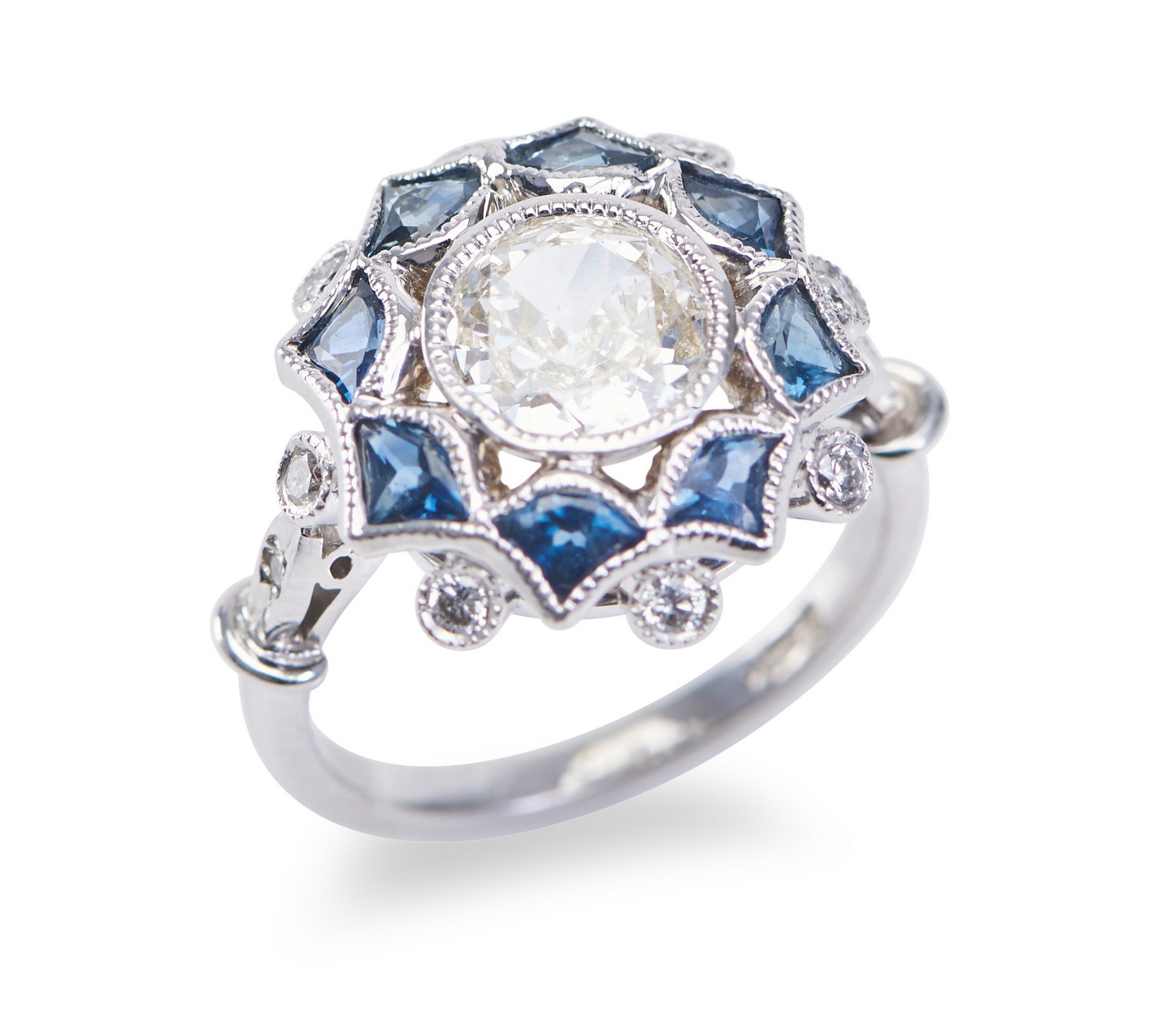 Of floral design, centrally set with a round brilliant cut diamond weighing an estimated 1.50cts, surrounded by calibre cut blue sapphires and diamonds, in 18ct white gold, ring size K.