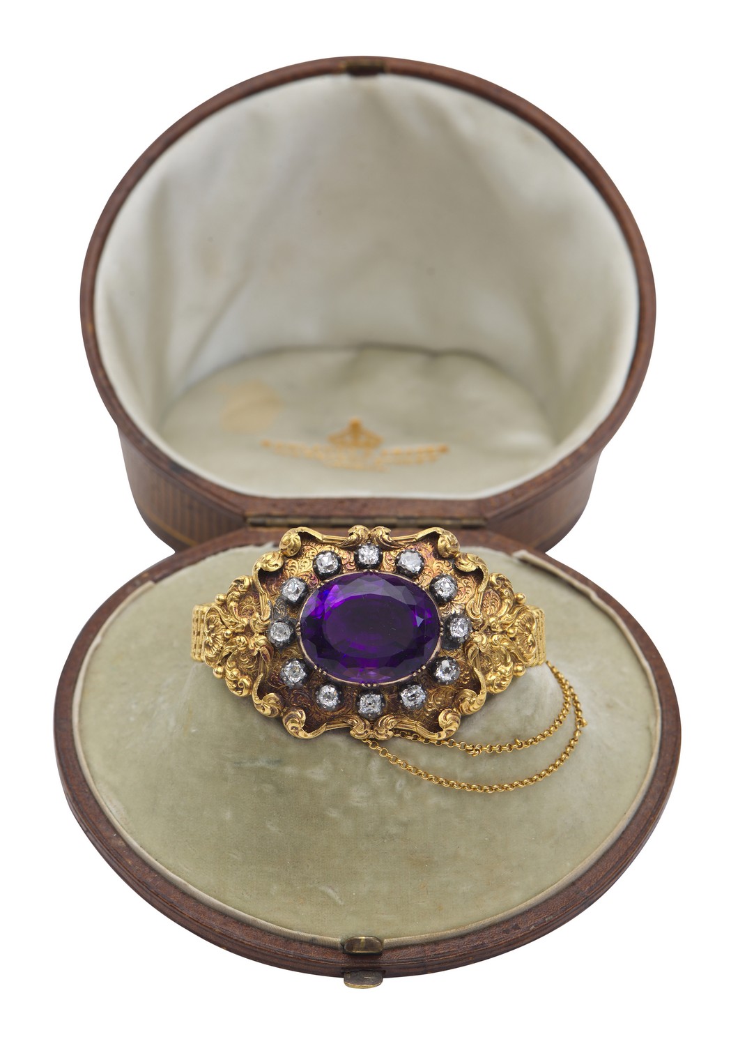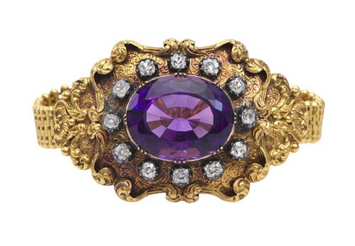 Comprising an oval amethyst within a surround of twelve old European cut diamonds,centred on an ornate repousse work plaque and mesh bracelet bands, in 15ct gold, in original fitted box by Rowlands & Frazer of London, circa 1860.