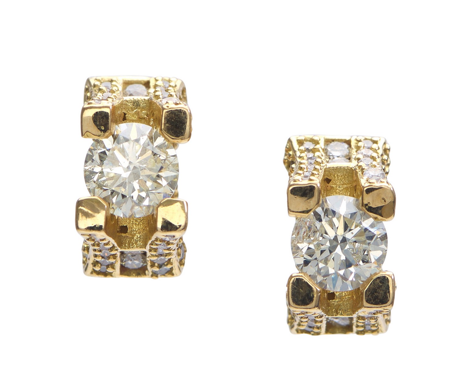 Of geometric design, each earring featuring a round brilliant cut diamond in raised diamond set claws and mount, in 18ct gold.