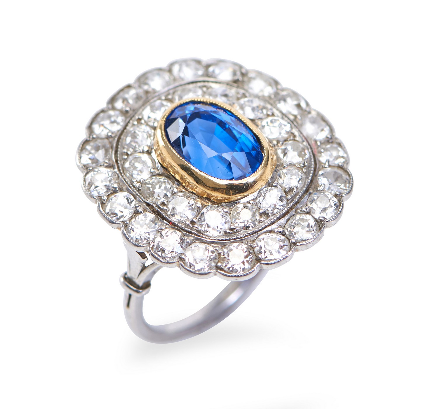 Of oval cluster design, featuring a sapphire weighing an estimated 3.08cts, within a double border of old European cut diamonds totalling an estimated 3.20cts, in 18ct gold and platinum.