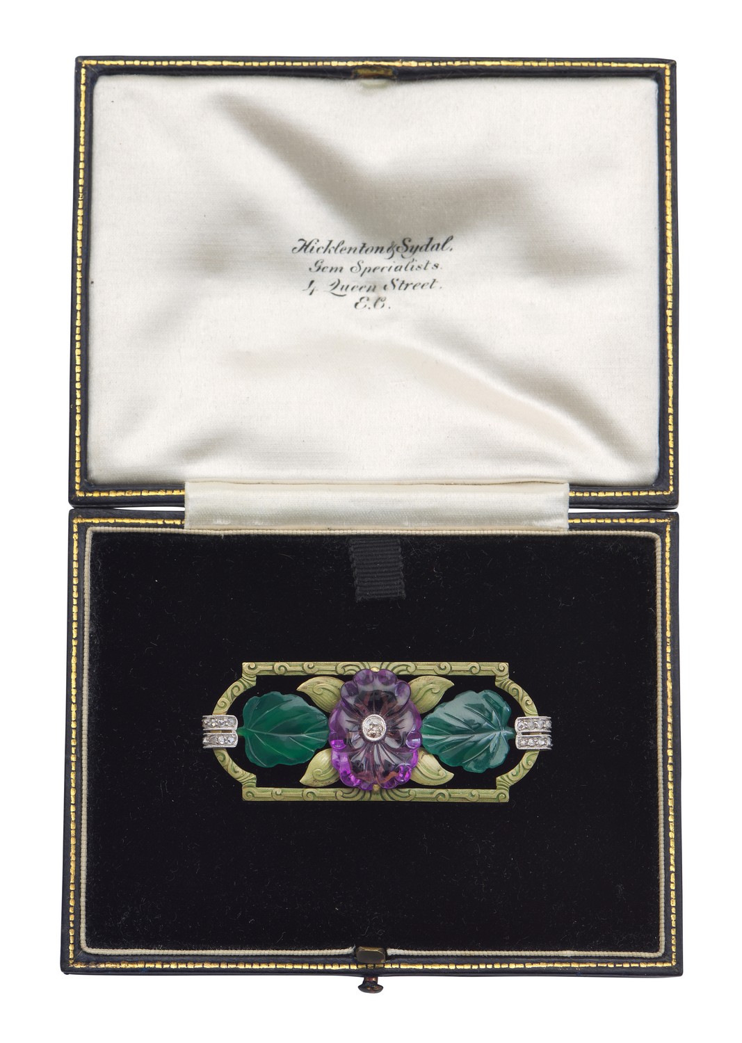 Featuring a carved amethyst flower centred with a single old European cut diamond, flanked by carved chrysoprase leaves, all mounted within an open geometric painted frame with embossed scrolls, detailed with rose cut diamonds, in 18ct gold, presented in original fitted box, by Hicklenton & Sydal, Gem Specialists, London.