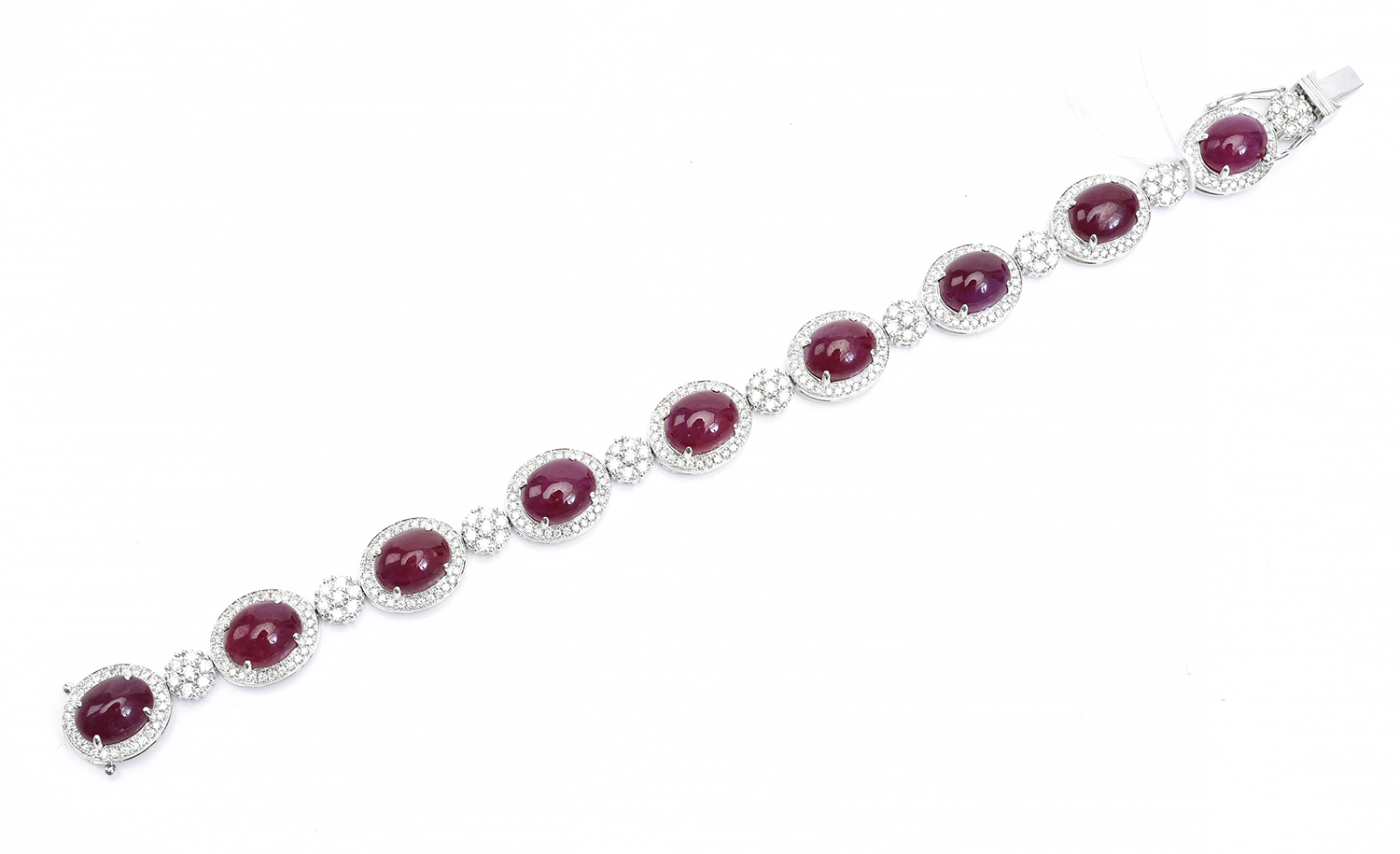 A GLASS FILLED RUBY AND DIAMOND BRACELET, THE RUBIES TOTALLING 35.98CTS AND DIAMONDS TOTALLING 2.98CTS, IN 18CT WHITE GOLD.