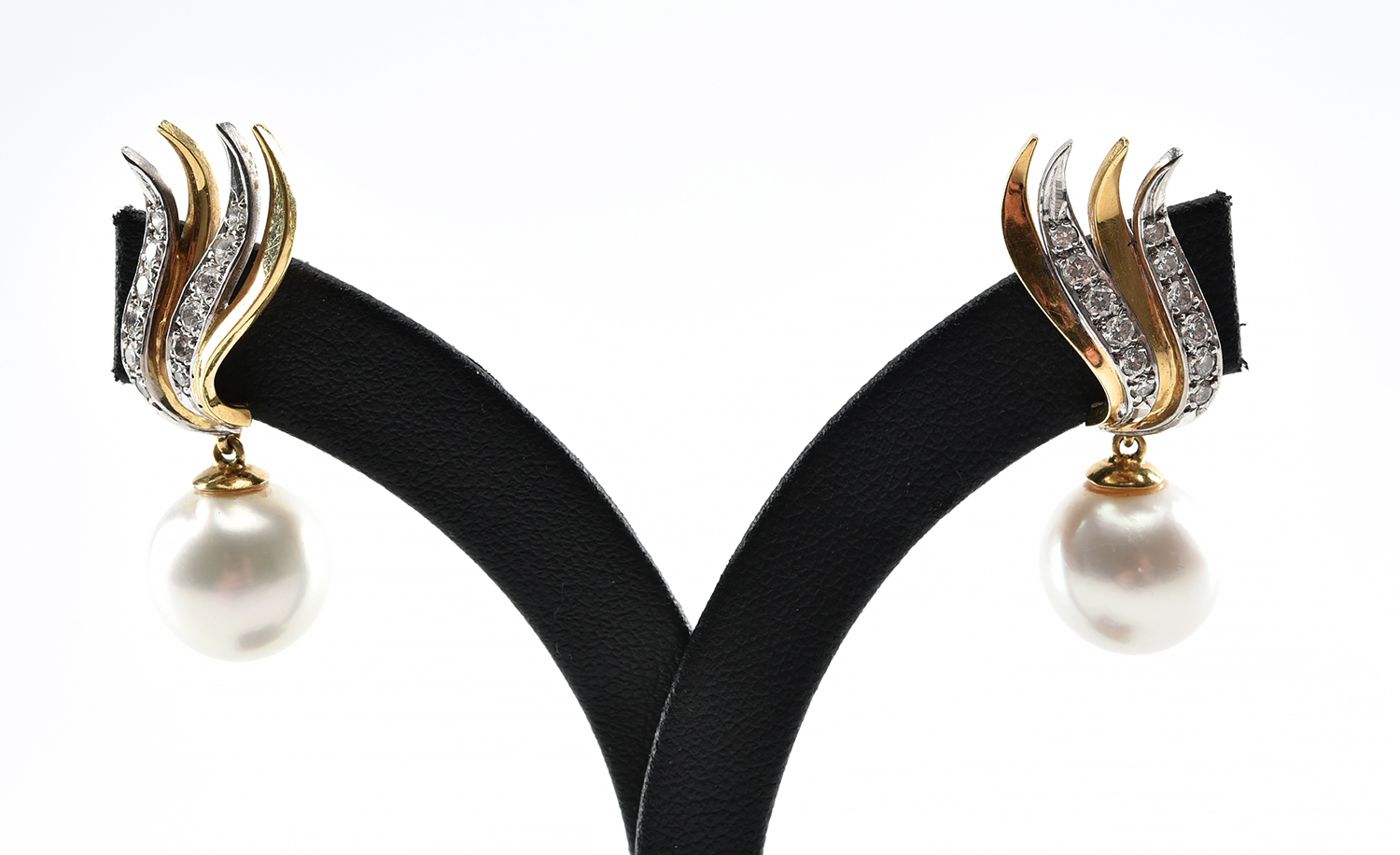 A PAIR OF SOUTH SEA PEARL AND DIAMOND EARRINGS - Each earring comprising a round pearl of silver white hues, measuring 11.7mm suspended below a diamond set spray style surmount, in two tone 18ct gold.