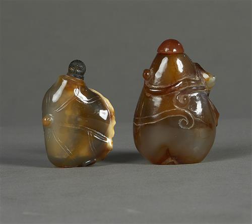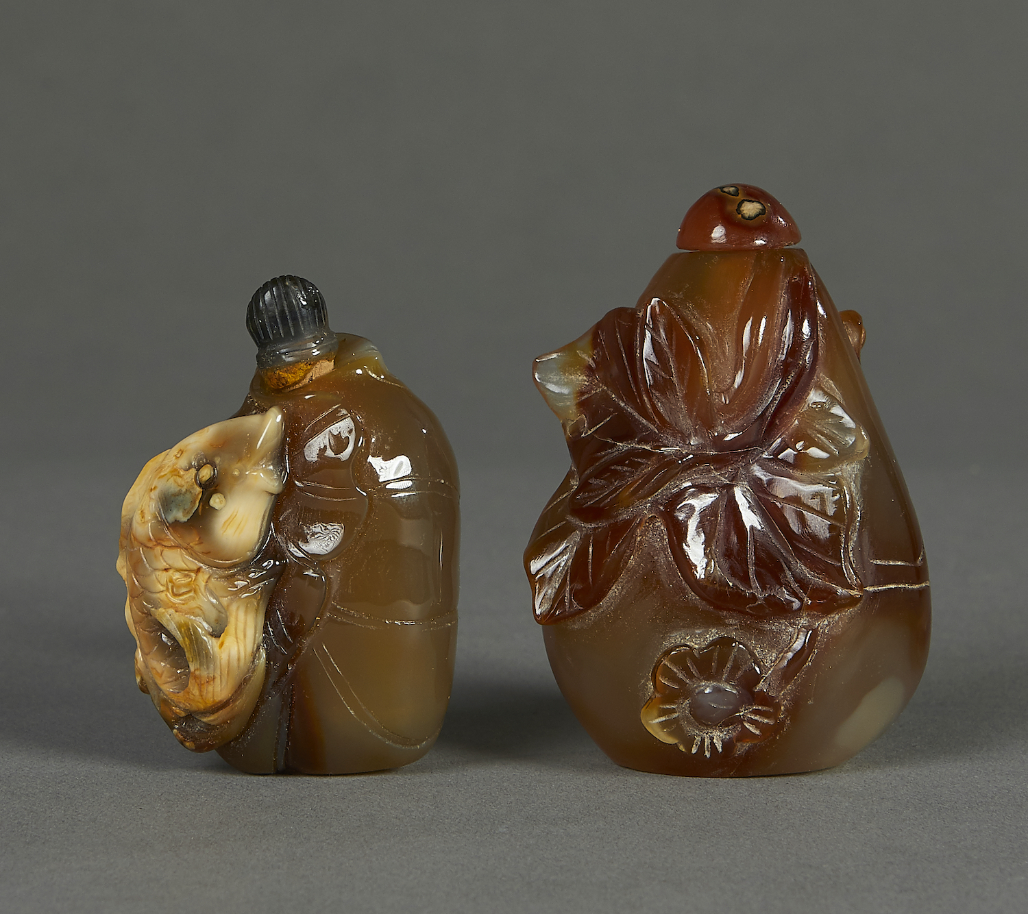 One carved with flowers and leaves, the other carved with a fish in relief.